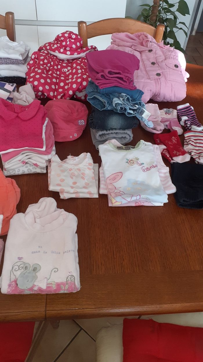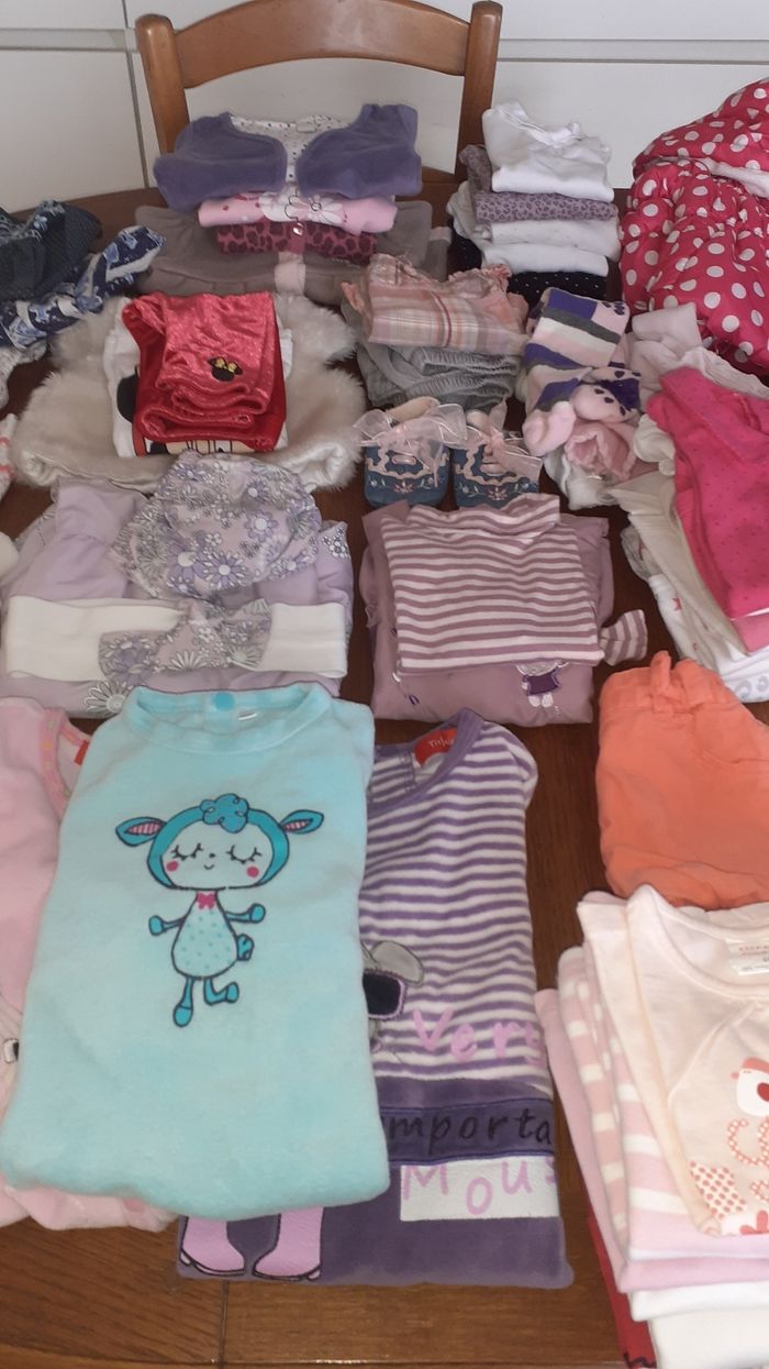 5 pyjamas, 7 Tee-shirt, 1 ensemble polaire, 5 robes, 6 sous pull, 8 bodies, 5 pantalons, 1 short, 1 ensemble Minnie, 3 gilets, 1 sweat, 2 chapeaux, 5 paires de chaussettes, 4 collants, 1 ensemble tunique pantalon, 1 ensemble à pois, 3 combishorts,1 leggin noir, 1 paire de chaussures souple, 1 blouson, 1 combinaison.
