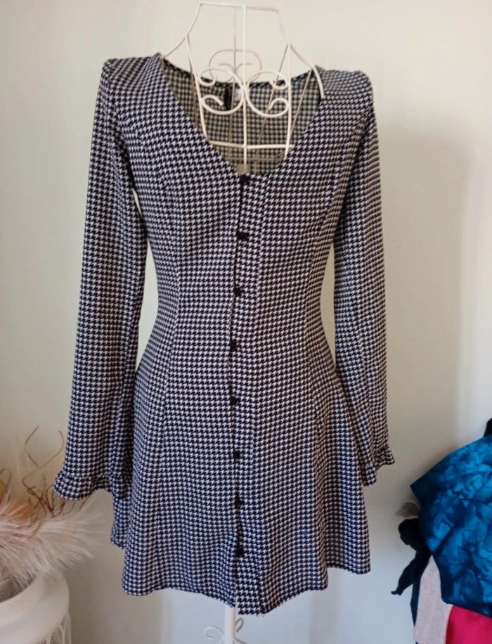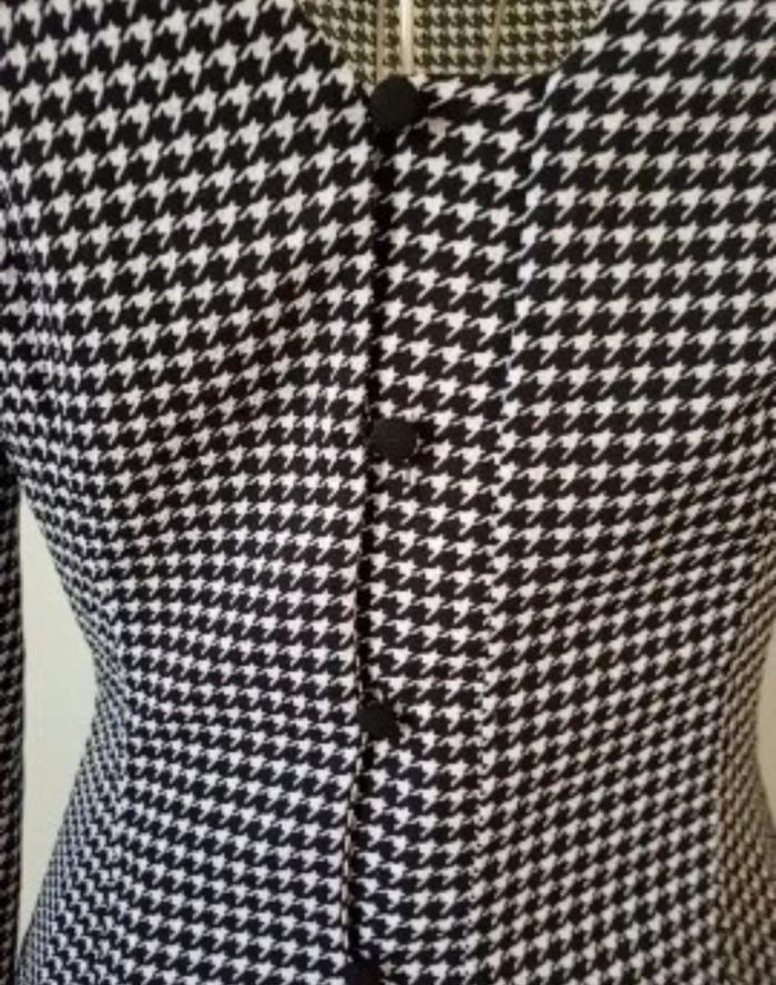Superbe tunique fluide cintrée avec boutons. Motif pieds de poule noir et blanc. Taille 32(xxs) mais convient aussi à un XS.
