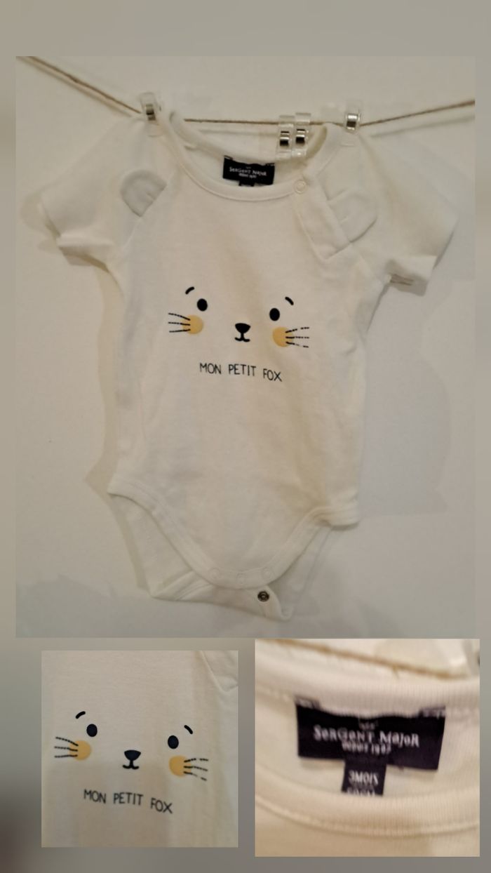 ce joli lot de 3 bodies à manches courtes en taille 3 mois, en excellent état. Parfait pour varier les styles tout en gardant bébé confortablement au chaud. ​ - ​1 Bodie Sergent Major : Écru avec une tête de petit renard trop mignonne ("Mon petit fox") et des petites oreilles en relief sur les épaules. Ouverture boutonnée à l'épaule. - ​1 Bodie Carter's : À rayures horizontales grises et blanches. Emmanchures américaines pour un habillage facile. - ​1 Bodie Blanc à motifs : Imprimé de petites notes de musique grises sur l'ensemble du bodie. ​ Très bon état, pas de taches ni de trous