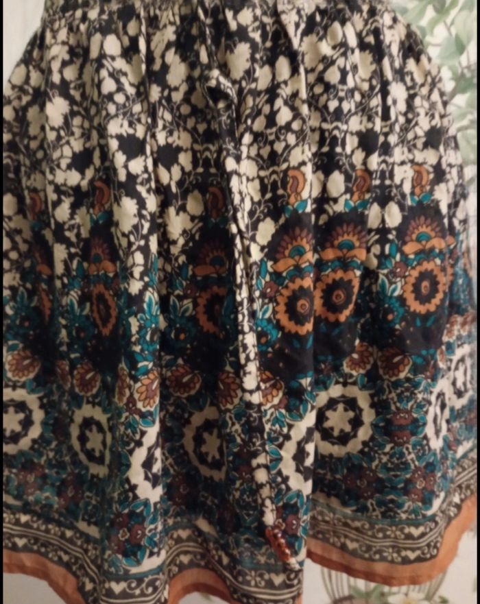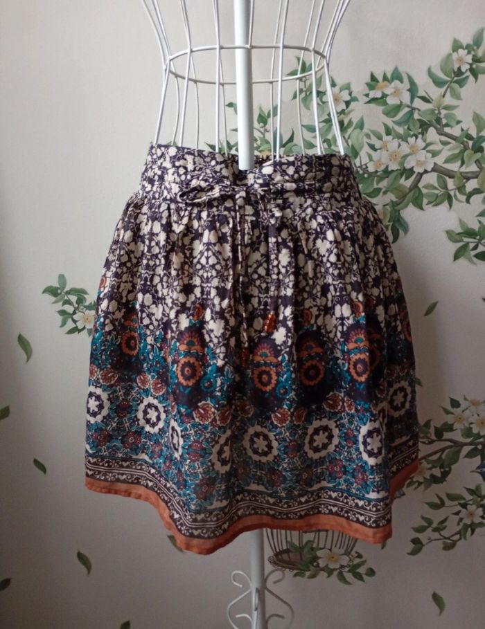 Jupe fluide style motif aztèques. Taille élastique avec cordon(et perles décoratives). Taille 38