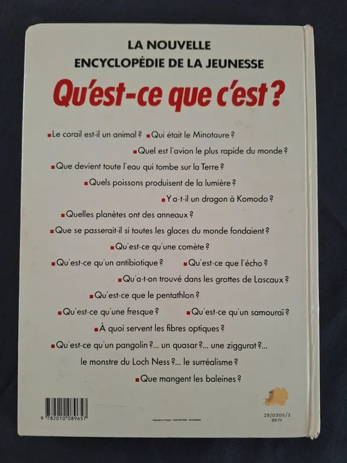 Découvrez Qu’est-ce que c’est ?, la grande encyclopédie jeunesse Hachette pleine de questions étonnantes et de réponses claires pour apprendre en s’amusant ! Un ouvrage ludique et instructif qui rassemble 300 questions et 300 réponses pour satisfaire la curiosité des enfants (et des adultes !) : animaux, sciences, mythologie, nature, histoire, phénomènes mystérieux… De « Qu’est-ce qu’une comète ? » à « Qui était le Minotaure ? », en passant par « Que deviennent les glaces si la Terre se réchauffe ? », ce livre explore le monde sous toutes ses facettes. Richement illustré, pédagogique et facile à lire, il constitue une superbe initiation à la découverte du monde. Caractéristiques Titre : Qu’est-ce que c’est ? Collection : La nouvelle encyclopédie de la jeunesse Éditeur : Hachette Format : Grand format cartonné Dimensions approximatives : 23 × 30 cm Épaisseur : ~1,5 cm Poids estimé : ~900 g ISBN : 978-2-010-089657 État : Correct (coins et bords usés, petite tache au dos — voir photos) Pourquoi l’acheter ? Très clair et idéal pour les jeunes lecteurs curieux 300 explications simples sur des sujets variés Illustrations nombreuses Parfait pour enrichir ses connaissances ou pour un cadeau éducatif Prix : 4 €