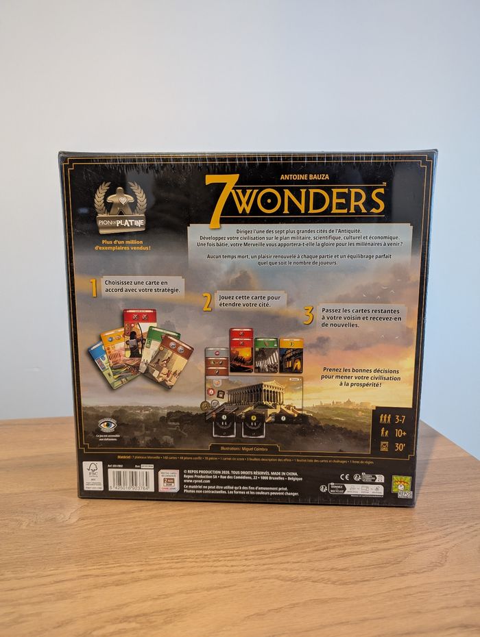 Vends le jeu de société 7 Wonders (Nouvelle Édition). La boîte est neuve sous cellophane, jamais ouverte, dans un état impeccable. - Joueurs : 3 à 7. - Âge : 10 ans et +. - Durée : 30 minutes. 📦 Envoi rapide et soigné. #7wonders #jeudesociete #neuf #strategie #cadeau