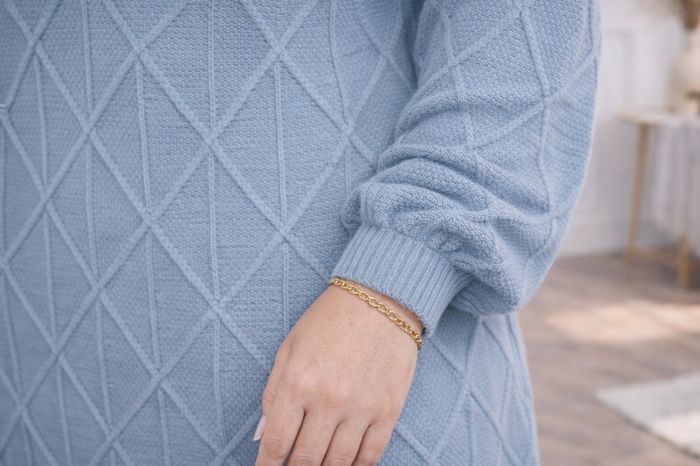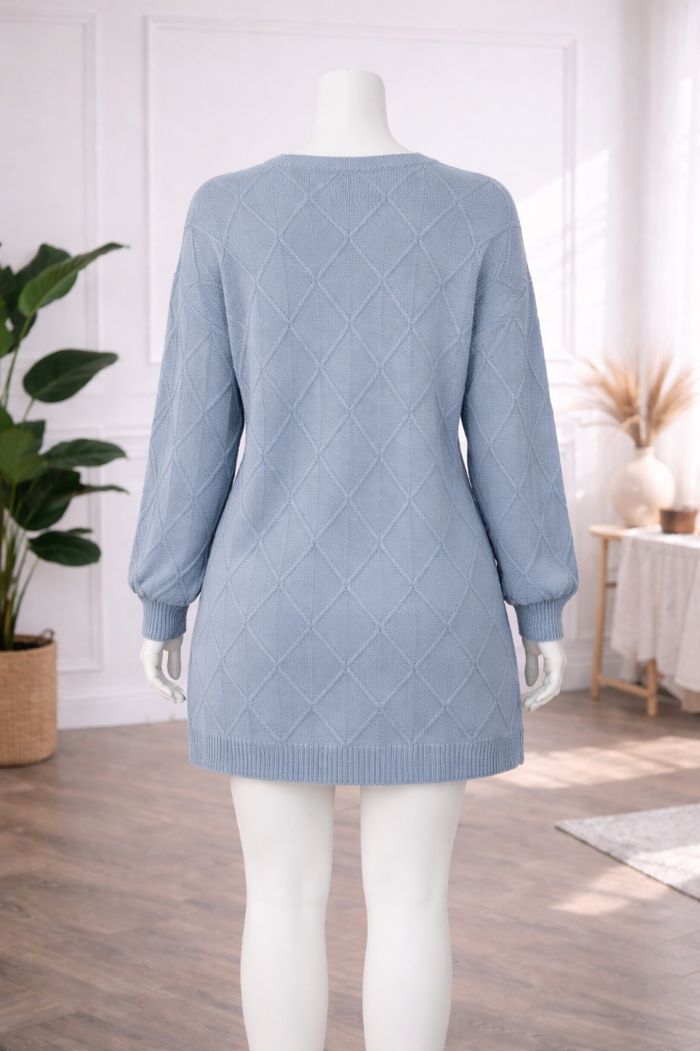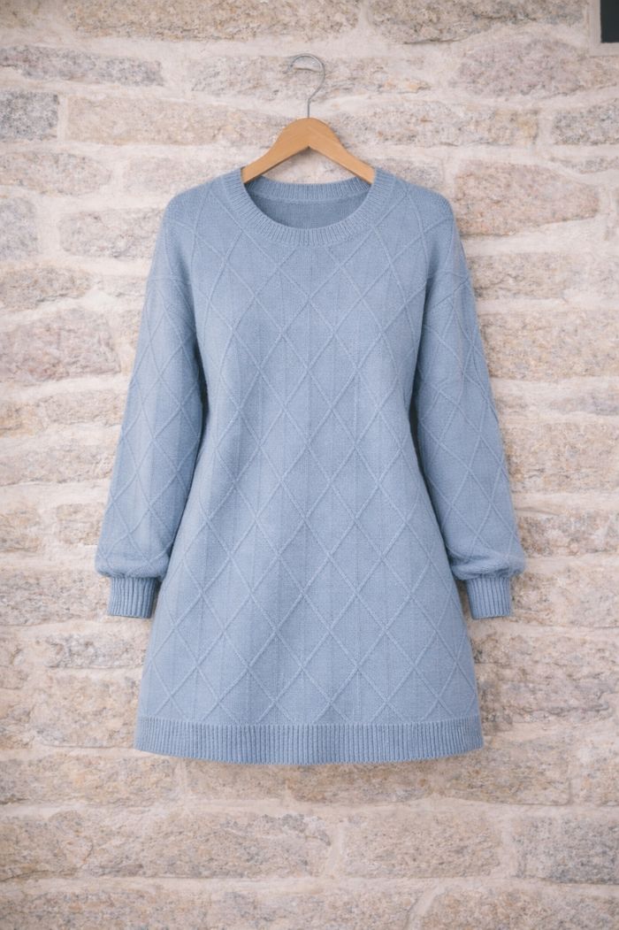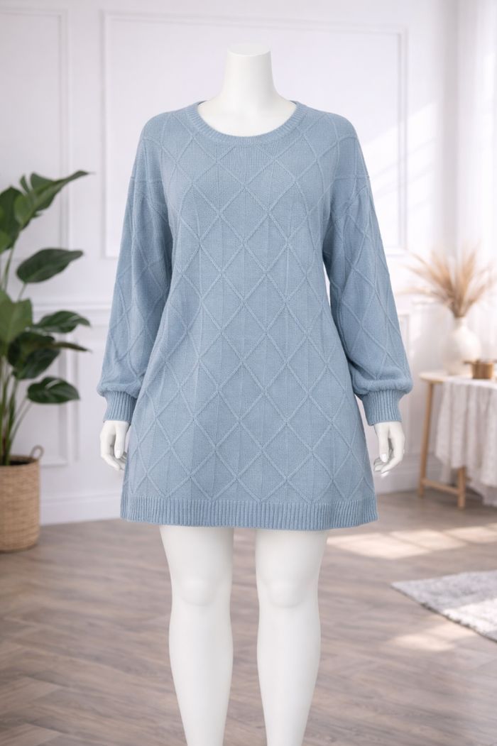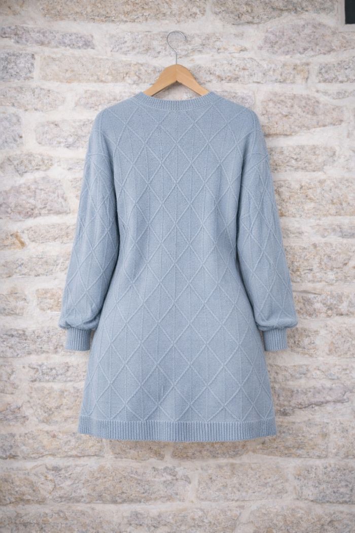 Robe pull en tricot maille losanges texturées bleue grise Femme taille 54 marque Asos ✴️ Manches longues ✴️ Col bateau ✴️ Ourlets bord côté ✴️ Maille losanges texturées ✴️ Couleur => Bleu gris ✴️ Composition => 100 % acrylique ✴️ Lonqueur => 93,5 centimètres ✴️ Mesure épaules à épaules => 68 centimètres ✴️ Tour de poitrine => 140 centimètres