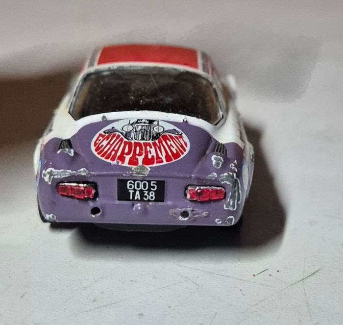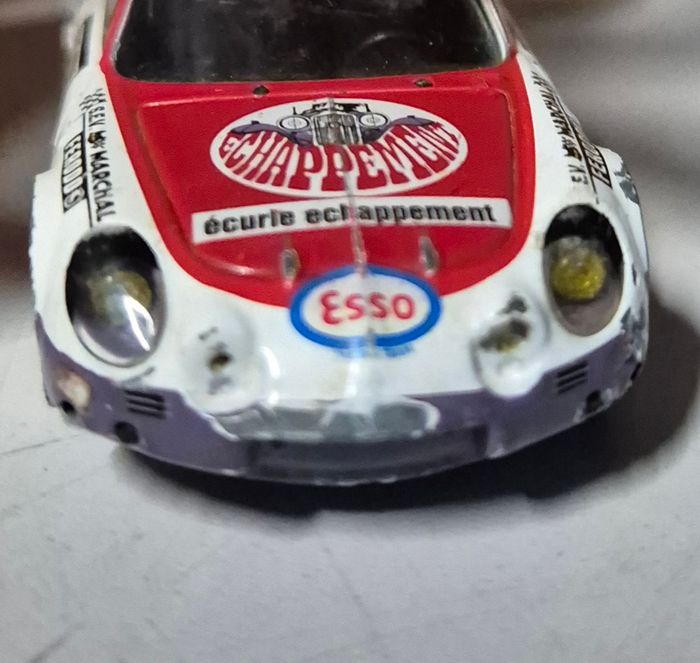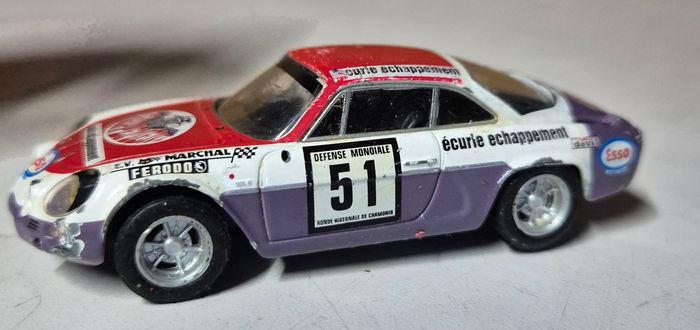Modèle réduit Éligor Alpine Renault A110 à l’échelle 1/43, livrée rallye écurie échappement avec numéro 51. Décorations complètes : Défense Mondiale, Ronde Hivernale de Chamonix, Chappey, Esso, Devil, Ferodo, Marchal, Texaco. Carrosserie rouge, blanche et violette avec vitrages transparents et jantes sport. Châssis estampillé Éligor Alpine Renault A110 1/43. Modèle présentant une usure marquée : peinture écaillée, stickers abîmés et traces d’usage. Etat conforme aux photos #eligor #alpine #a110 #alpinerenault #rallye #rondehivernale #voitureminiature #modelereduit #collectionminiature #rallyehistorique