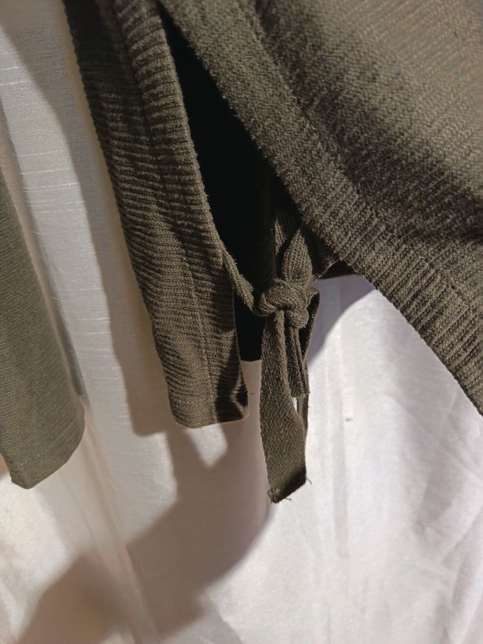 petit pull vert kaki cotelé encolure ronde fendu sur les cotés à nouer largeur épaules50 largeur poitrine51 longueur manches52 longueur total57