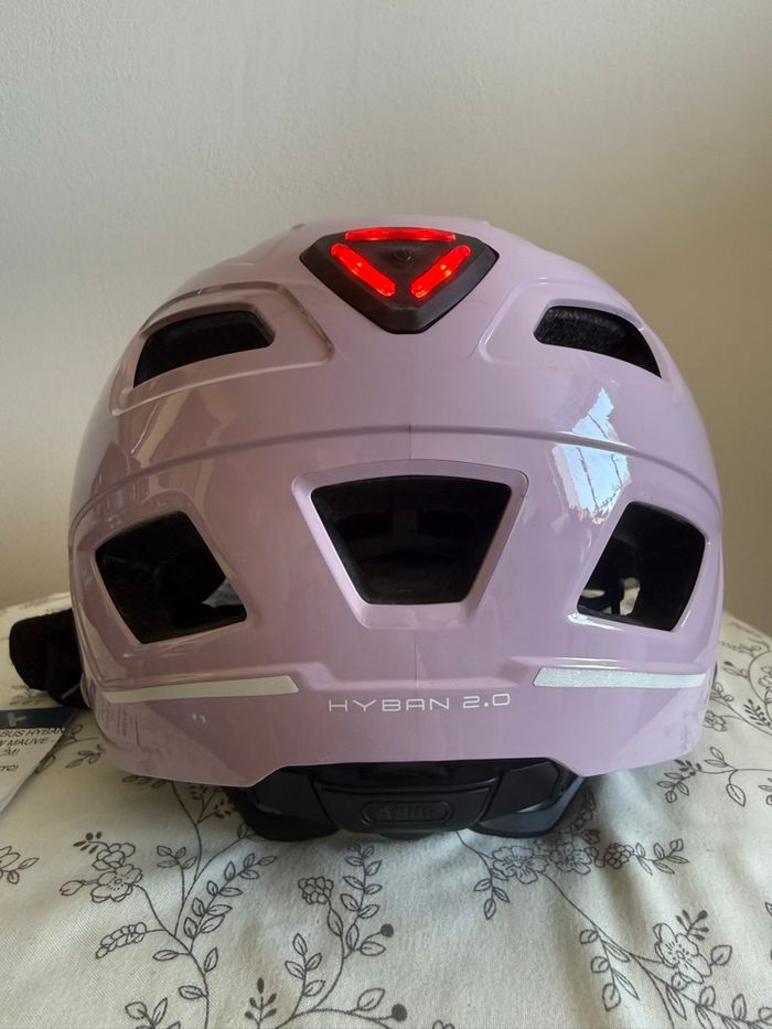 Casque de la marque Abus, désignation Hyban 2.0. LED arrière deux positions. Neuf, sans emballage d’origine. Mauve pastel, rose, violet.