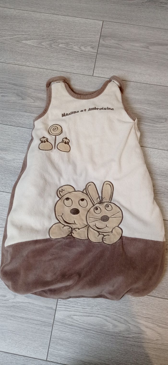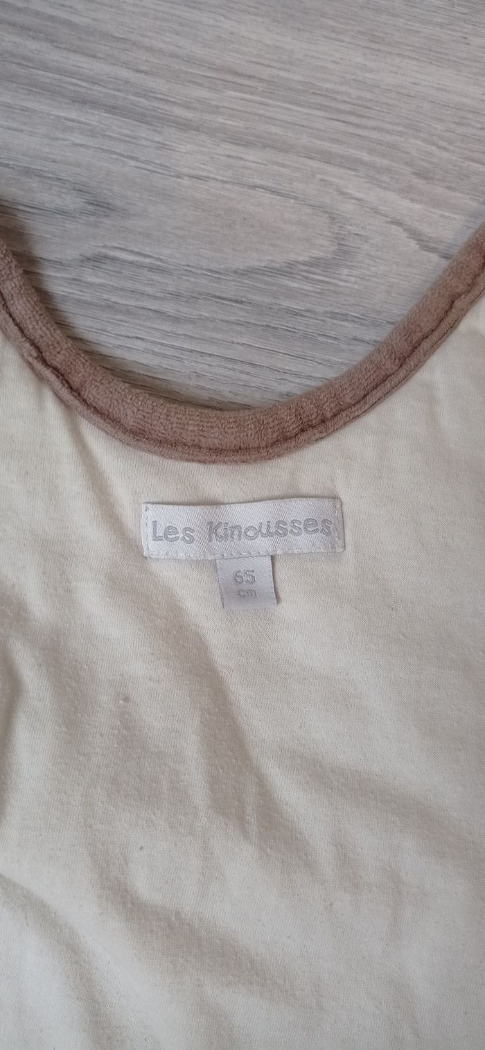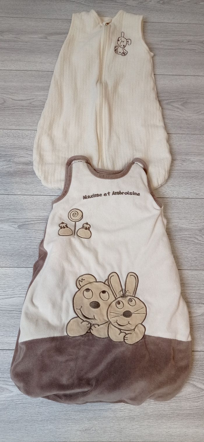 Je vends 2 gigoteuses naissance a 6 mois environ. L'une est légère sans manches et l'autre est plus épaisse de la marque les kinousses et sans manches aussi. Elles sont en très bon état