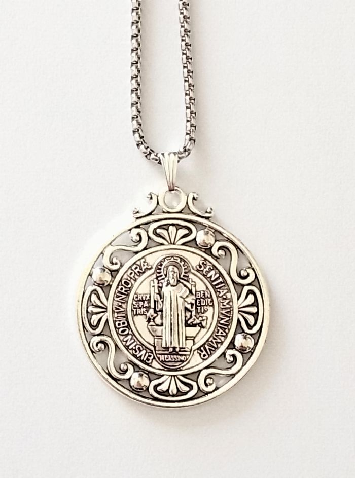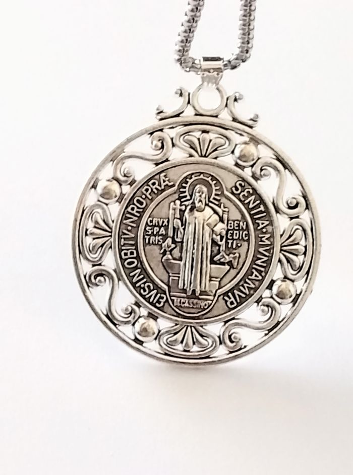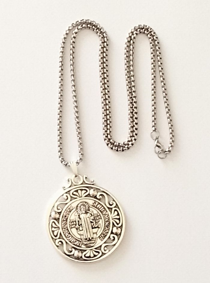 Chaîne + pendentif religieux. Pendentif : médaille, motif : saint benoît, croix. (religieux, spirituel, protection, celtique, idéal cadeau) DESCRIPTIF : Pendentif double face. Couleur : argenté. Taille chaîne : 60 cm Diamètre pendentif : 4 cm L * 4,7 cm H Envoi rapide et soigné.