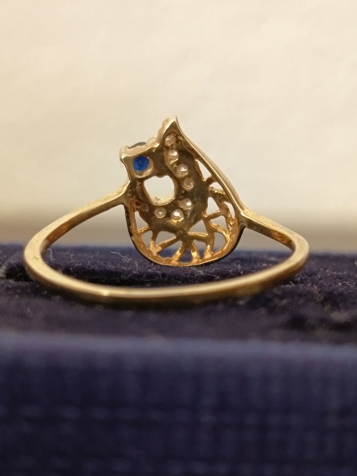 Bague plaqué argent ornée d'une pierre bleue et de plusieurs petits zirconiums blanc. Taille 54. Poinçon. Très bonne état.