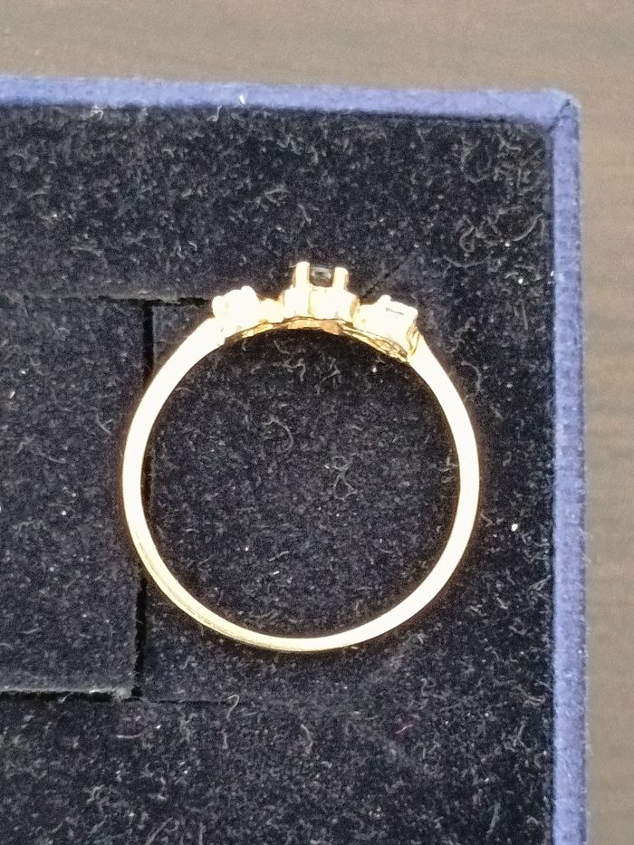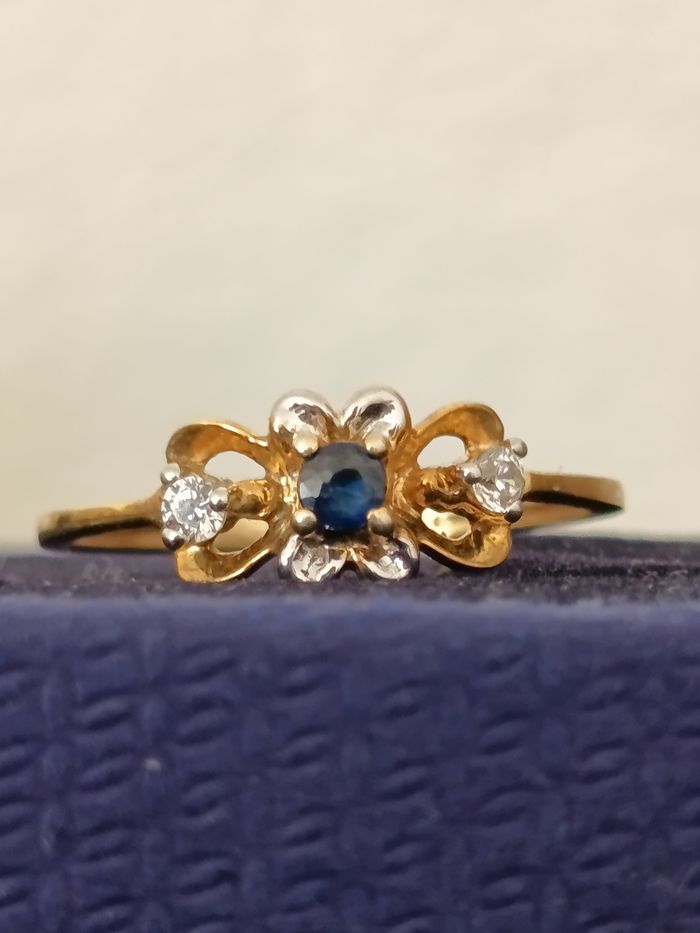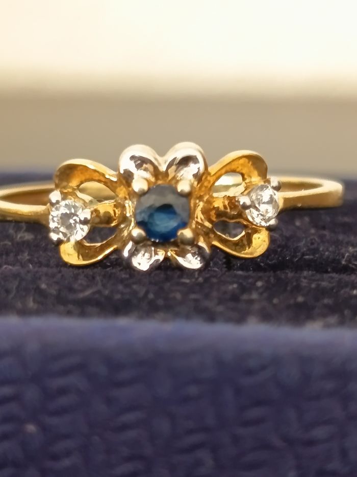 Bague plaqué argent ornée d'une pierre bleue et d un petit zirconium blanc de chaque côté.Taille 54. Poinçon. Très bonne état.