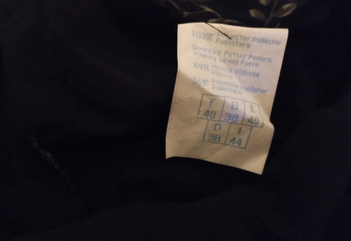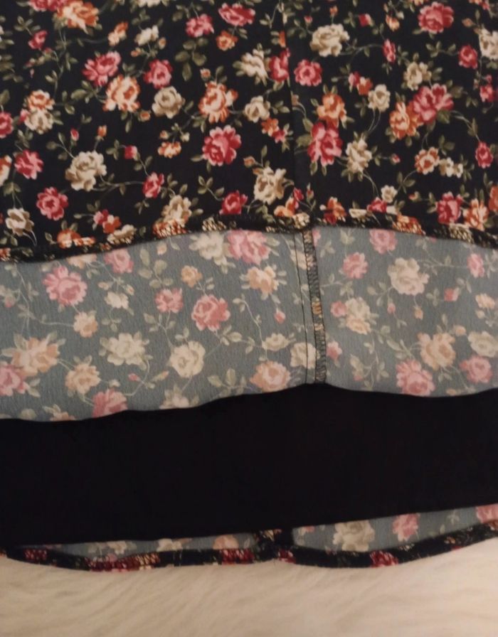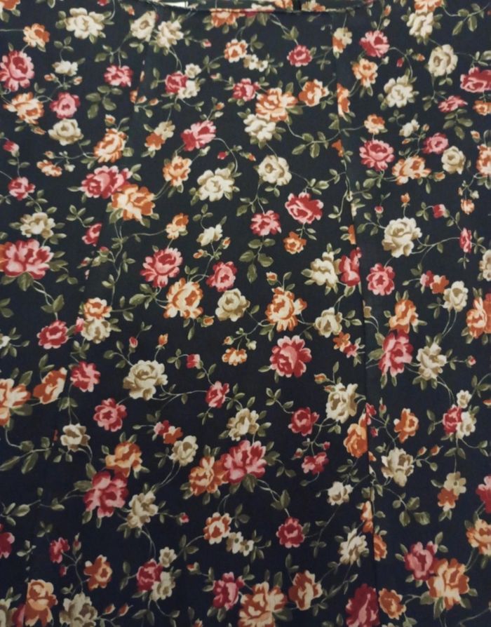 Jupe patineuse fleurie en voile avec doublure en dessous . Taille 40 mais taille petit vaut plutôt pour un 38. Couleur noir bleuté. Mesure 45 cm de long.