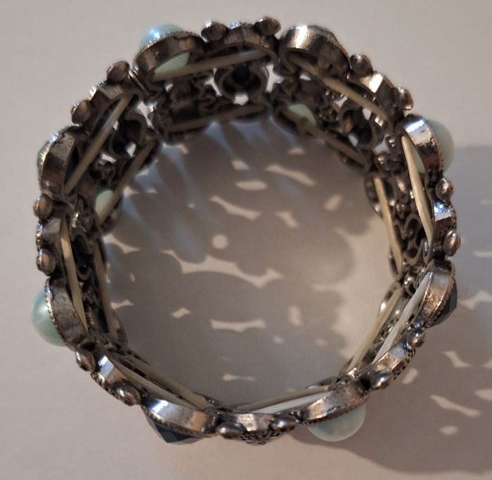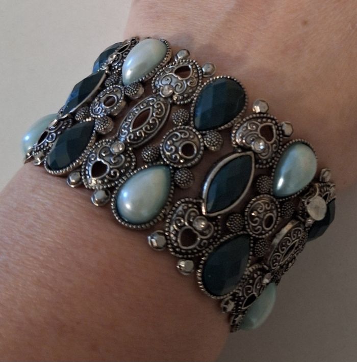 Bracelet manchette en métal argenté avec des pierres bleues foncées taillées et des pierres bleues claires lisses. Les pierres sont en forme de gouttes d'eau. Le bracelet est élastiqué pour l'enfiler. La largeur est 4 cm. Il y a une toute petite médaille de la marque.