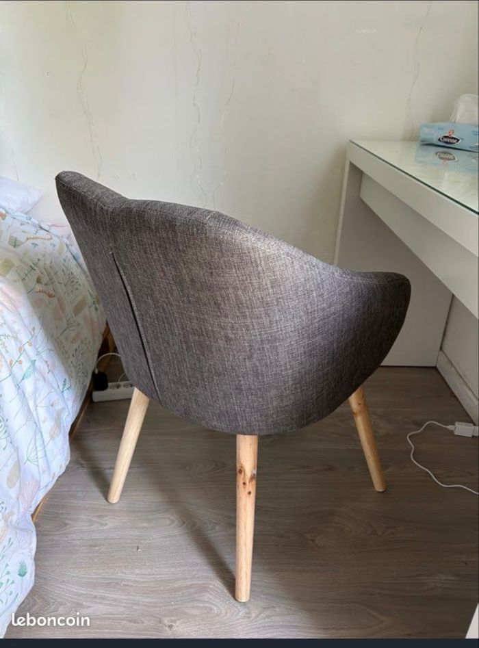 Je vends ce fauteuil de bureau. - Type de produit : Fauteuil de bureau - Couleur : Gris - Matériau : Tissu - Pieds : Bois Très bon état N'hésitez pas à me contacter pour plus d'informations.