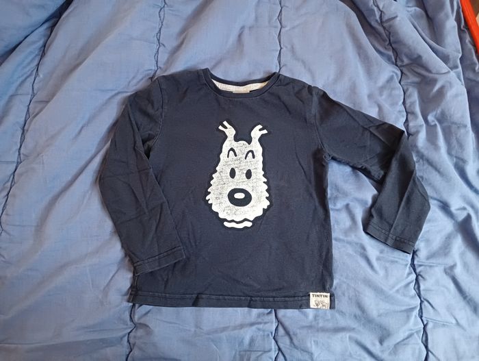 🔹Haut manches longues thème "Tintin" avec dessin de Milou . ✨ Taille 4ans (102cm) ✨ En bon état, dessin de Milou reste en bon état aussi ( voir les photos) ✨ Col rond et couleur marine #tintin #milou