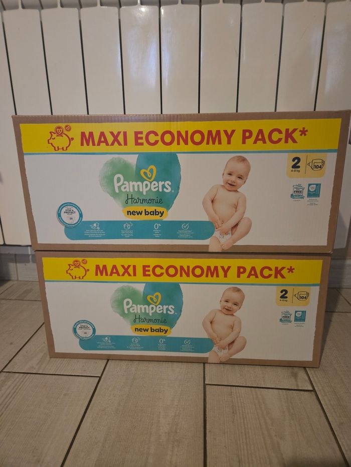 Pampers harmonie taille 2 Cartons neufs 208 couches au total Envoie rapide en semaine Svp ne faites pas de lot avec 4 cartons au total, le point relais me bloque les colis. Possibilité de faire des annonces avec 3 cartons sur demande, sous réserve de stock