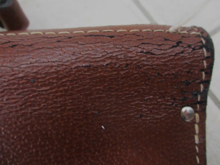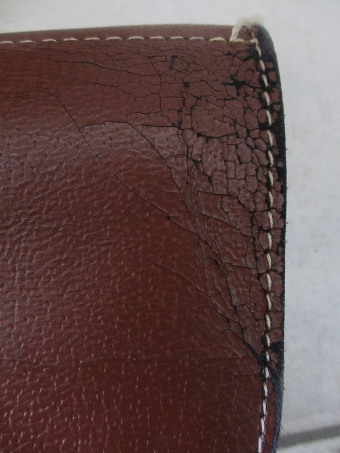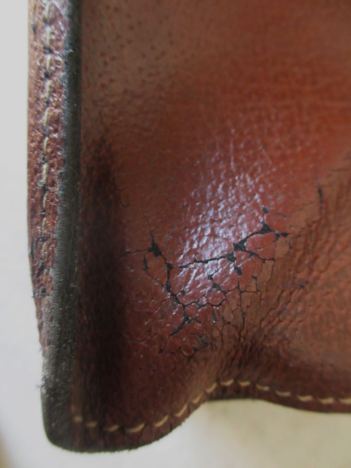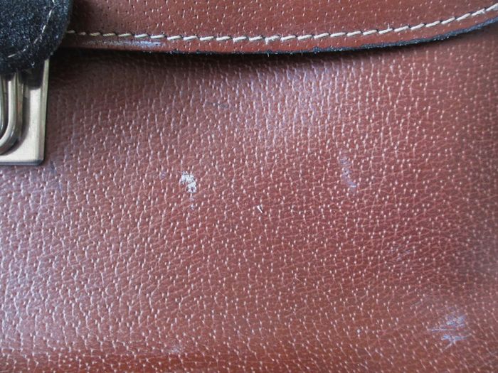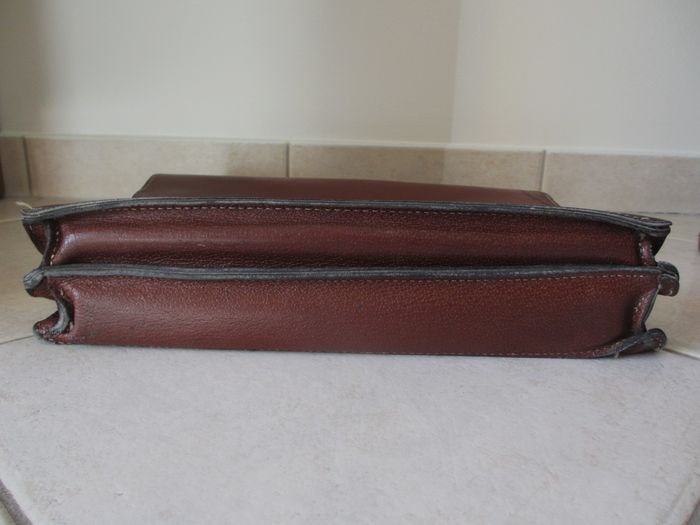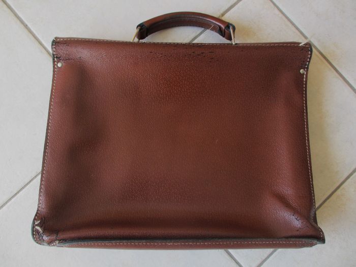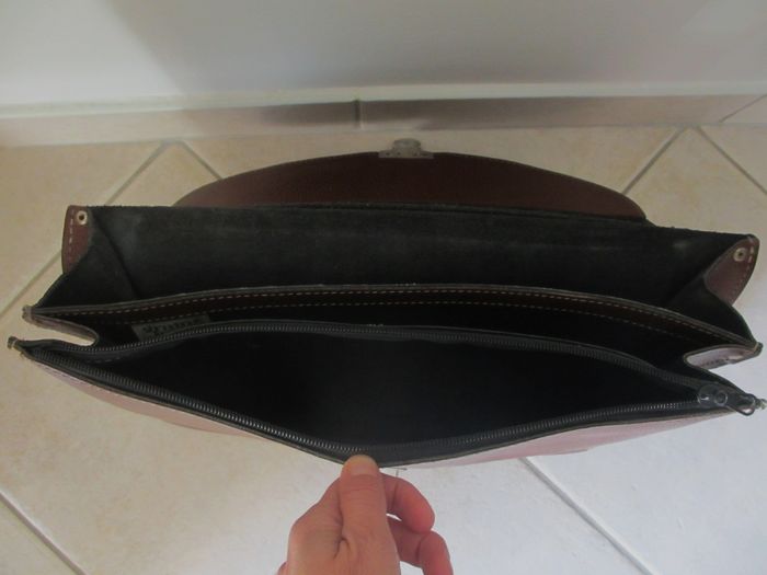 Sacoche marron Grain Pécari en croûte de cuir de vache avec poignée de transport Dimensions : 37,5 x 30 x 10 cm. 2 compartiments + 1 grande poche zippée. Bon état (cuir craquelé à tous les angles et sur le haut + quelques taches sur le devant : voir photos).