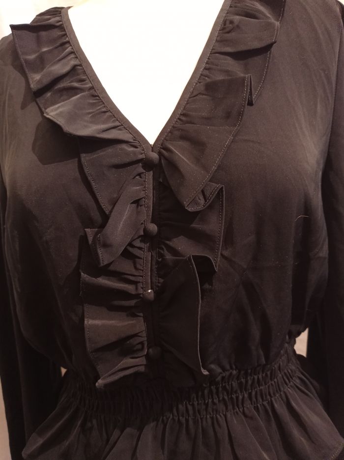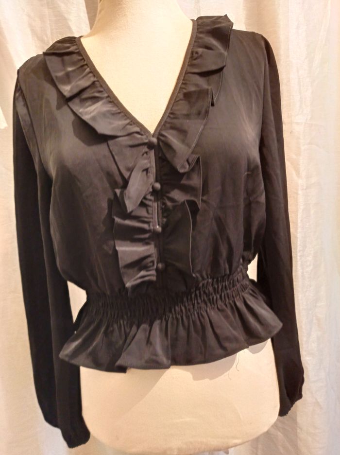 porté une fois pour une soirée rouge et noir encolure en V avec revers volant autour 4 boutons devant smocks avant petit volant dans le bas largeur épaule 39 largeur poitrine 49 longueur manches 64 avec poignets élastiqués longueur total 50