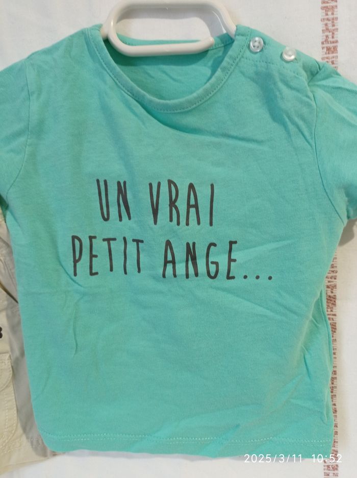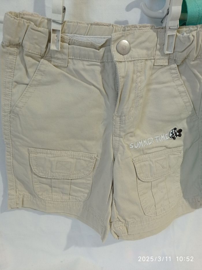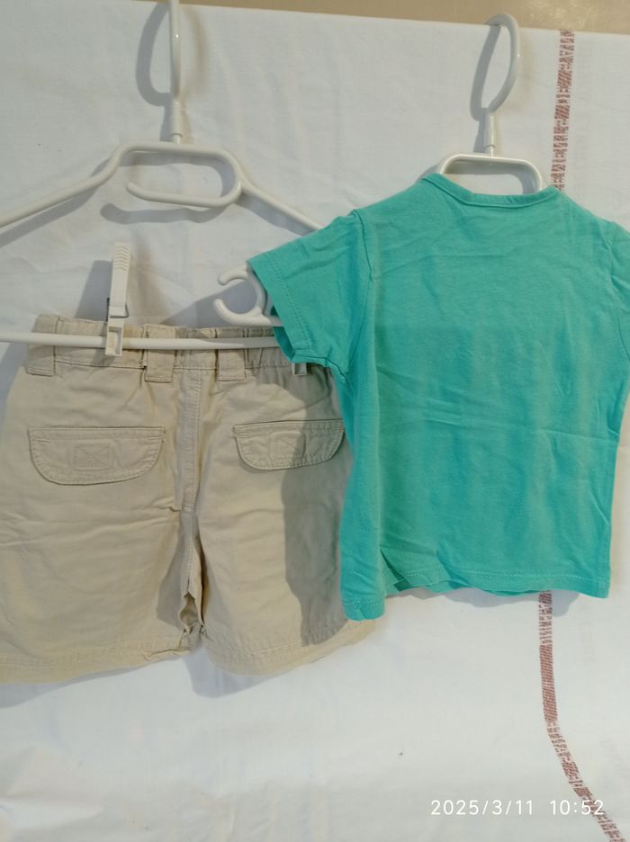 10 articles à 2€ =15€ le short beige de Bougli Bougla fermé devant par un pression et une fermeture zippée un élastique sous tunnel deux poches cotées deux poches cuisses le tee shirt vert avec inscription