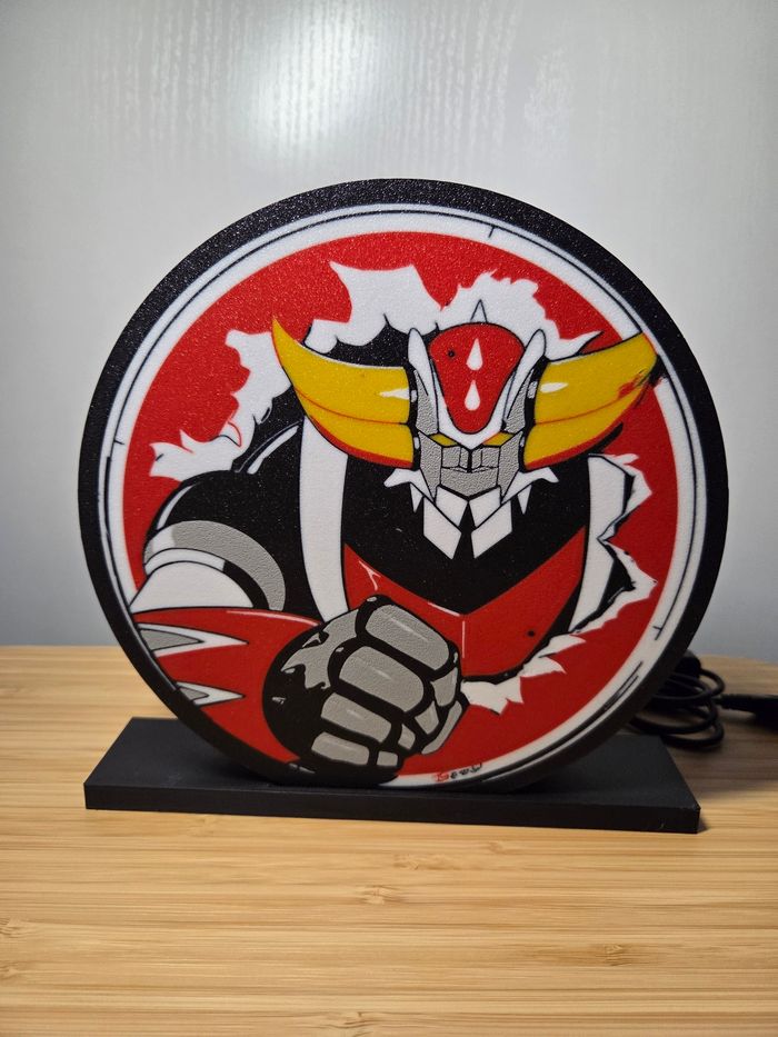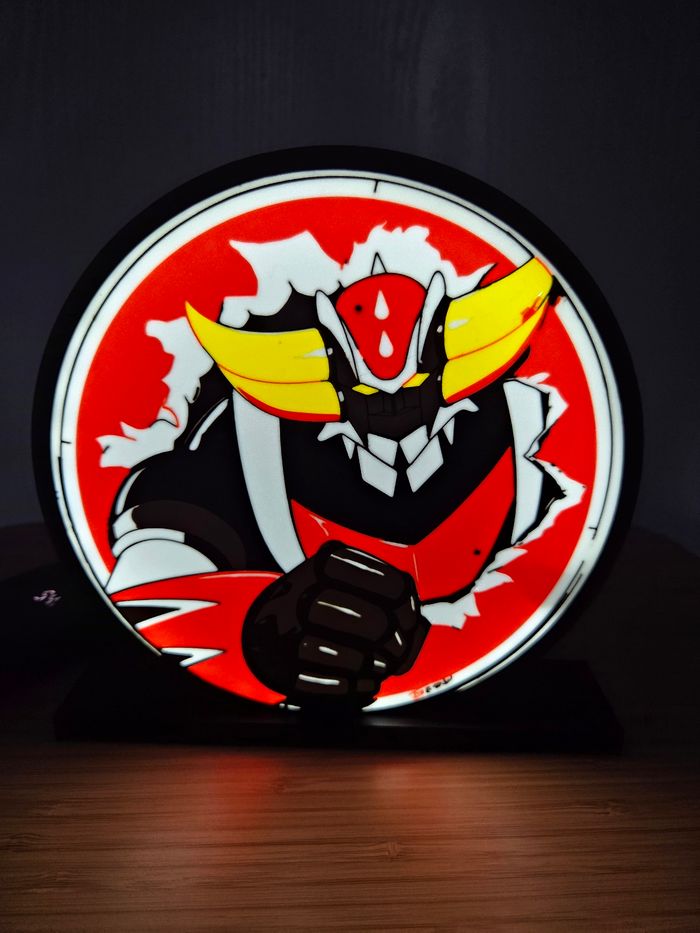 Décoration lumineuse Goldorak. Réalisée en impression 3D. Éclairage Led, alimentation USB avec interrupteur. Diamètre : 18 cm Épaisseur : 3 cm