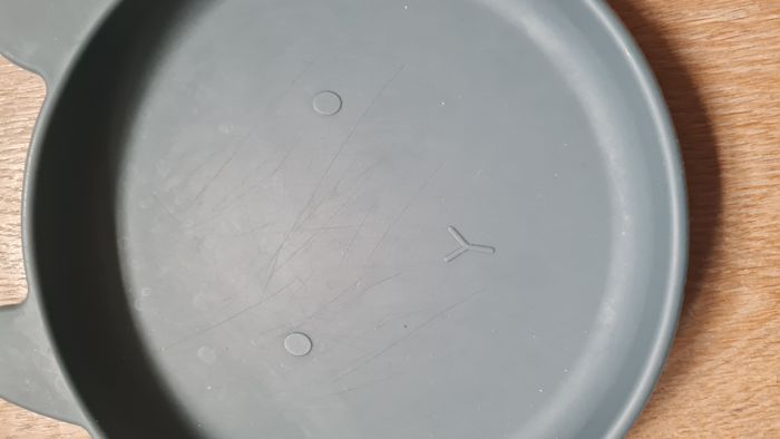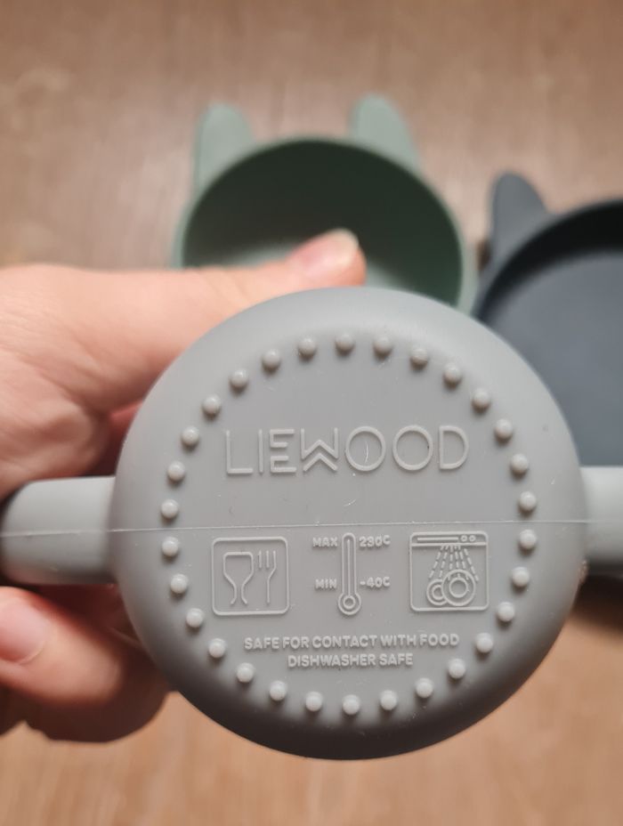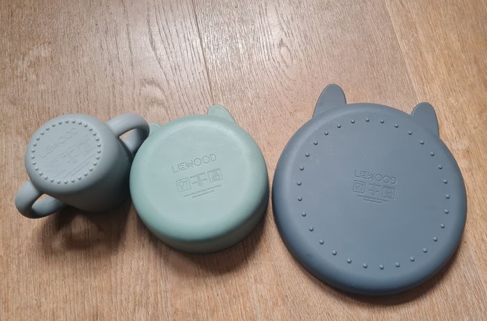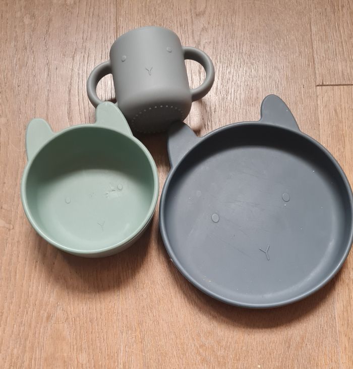 Une assiette creuse Une assiette plate Et une tasse (neuve) Matiere silicone Marque Liewood L'assiette presente des marques de couteaux comme le bol ;)