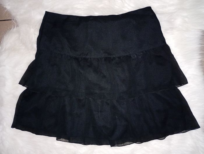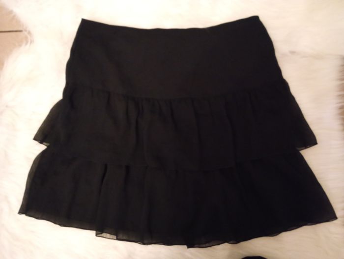 Très jolie Jupe à volants taille 42. En voile doublée Couleur noire. Fermeture éclair sur le côté.
