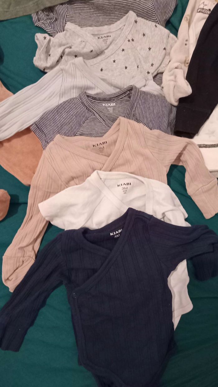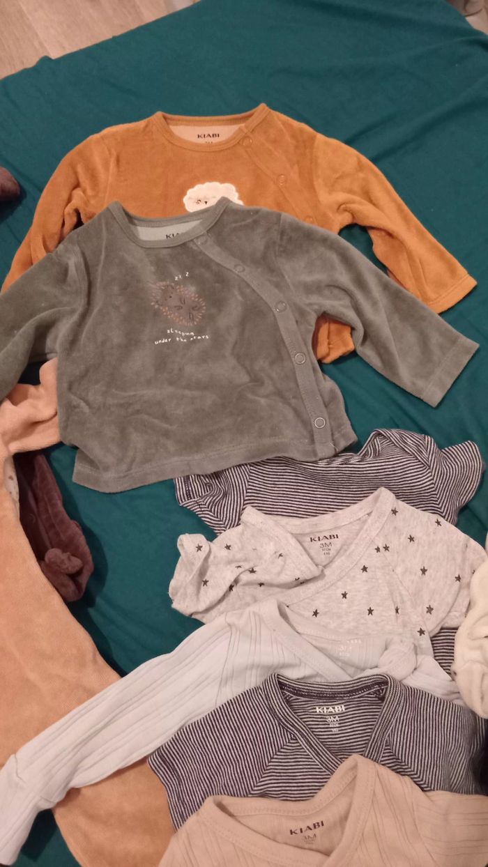 En très bons états mit que quelques fois car grossit vite. Dans la 1ère photo vous avez 3 pyjamas 3mois, Dans la 2eme 3 pyjamas 0/1mois, Dans la 3ème 3 body à manches longues 3mois, et 3 body manche courtes 3 mois aussi. Dans la 4ème voys avez 3 petits collants 0/3mois et pantalon pyjama de 3 mois, Et dans la dernière photo il y a 2 vestes pull de 3 mois. à récupérer sur commercy.