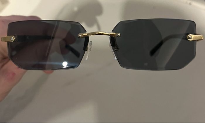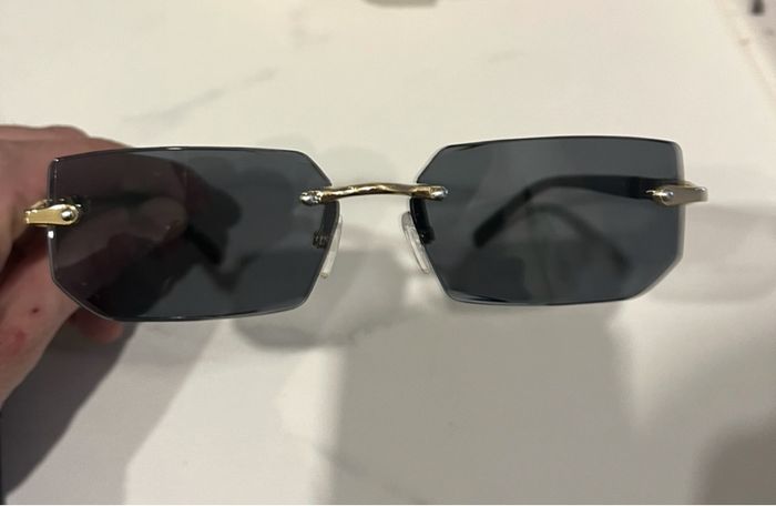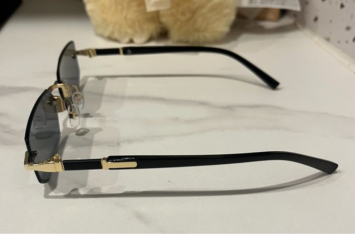 lunettes de soleil rectangulaires ultra tendance 🖤 ✔️ Verres fumés noirs ✔️ Monture minimaliste sans contour (style rétro / Y2K) ✔️ Détails dorés élégants ✔️ Branches noires fines ✔️ Très bon état Modèle mixte, parfait pour compléter un look chic ou streetwear. Effet garanti ☀️ Envoi rapide et soigné 📦
