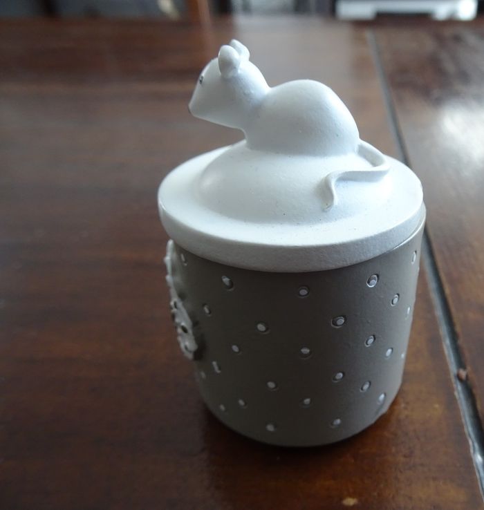 Boite à dents de lait en résine blanche et beige avec une petite souris sur le couvercle. En bon état.