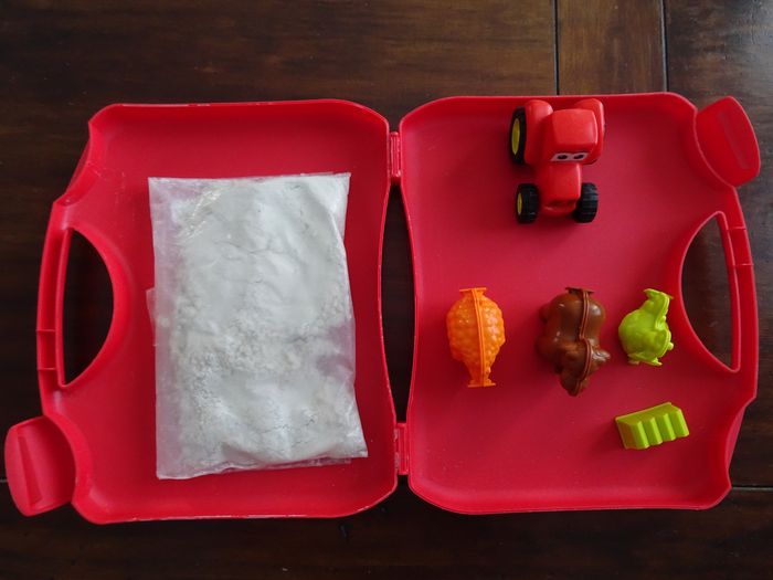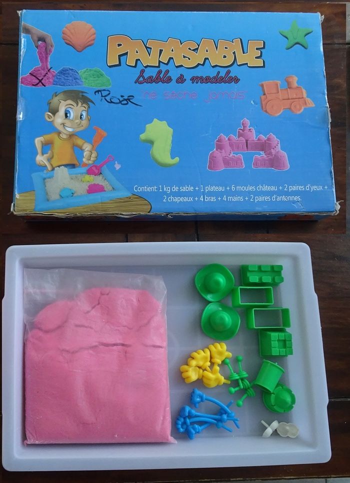 Lot de sable magique à modeler comprenant: *1 valisette rouge de Super Sand comprenant 1 sachet de sable blanc, 1 tracteur, 1 foin et 3 animaux. *une boite de sable à modeler comprenant 1 sachet de sable blanc, 1 plateau en plastique, 6 moules château, 2 paires d’yeux, 2 chapeaux, 4 bras, 4 mains et 2 paires d’antennes. *11 moules animaux supplémentaires Lot en bon état.