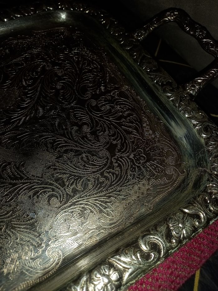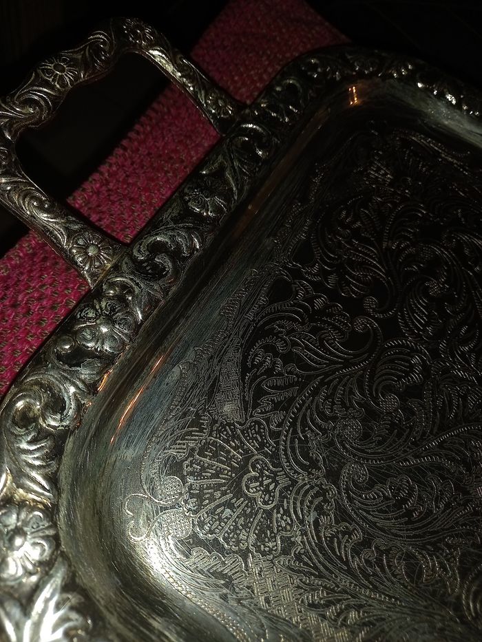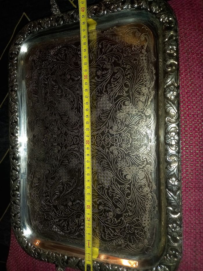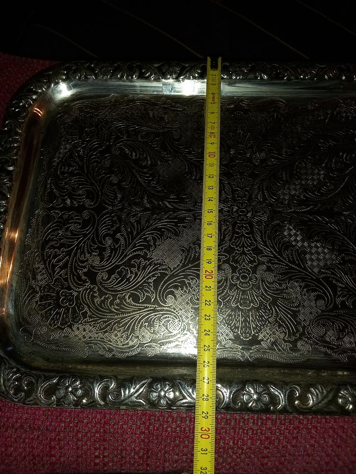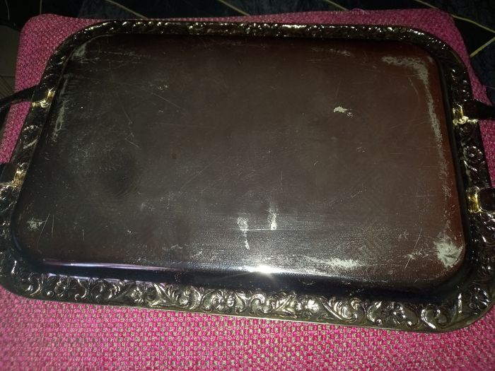 Très beau plateau de service,quelques traces d'usures, mais reste en bon etat,métal couleur argent,regardez les photos pour vous donner une idée et voir les dimensions. N'hésitez surtout pas à me contacter si besoin.