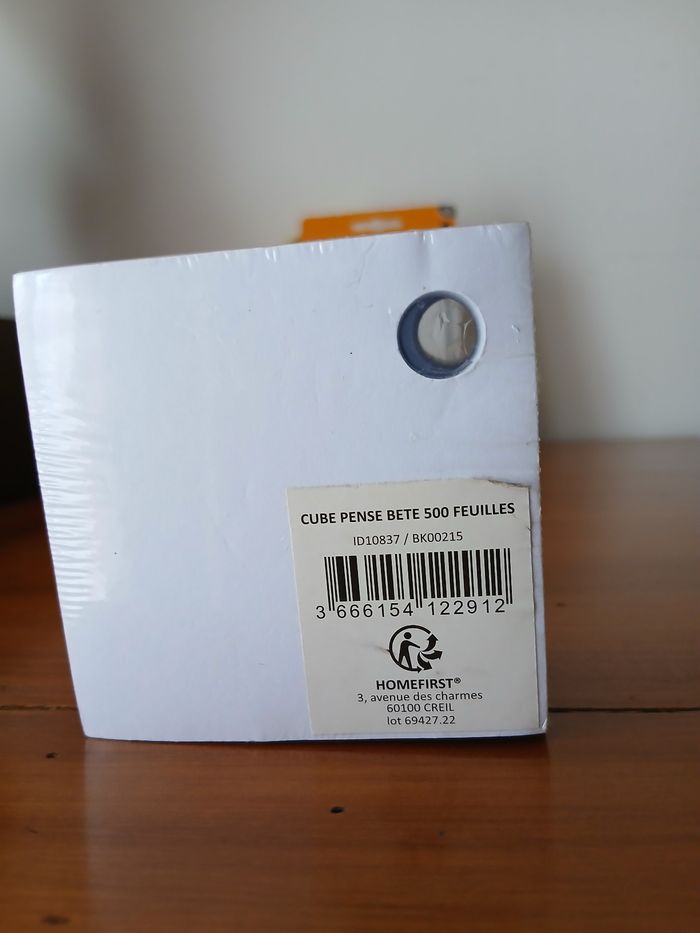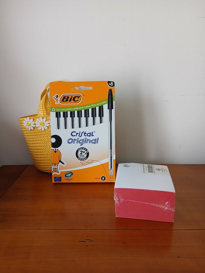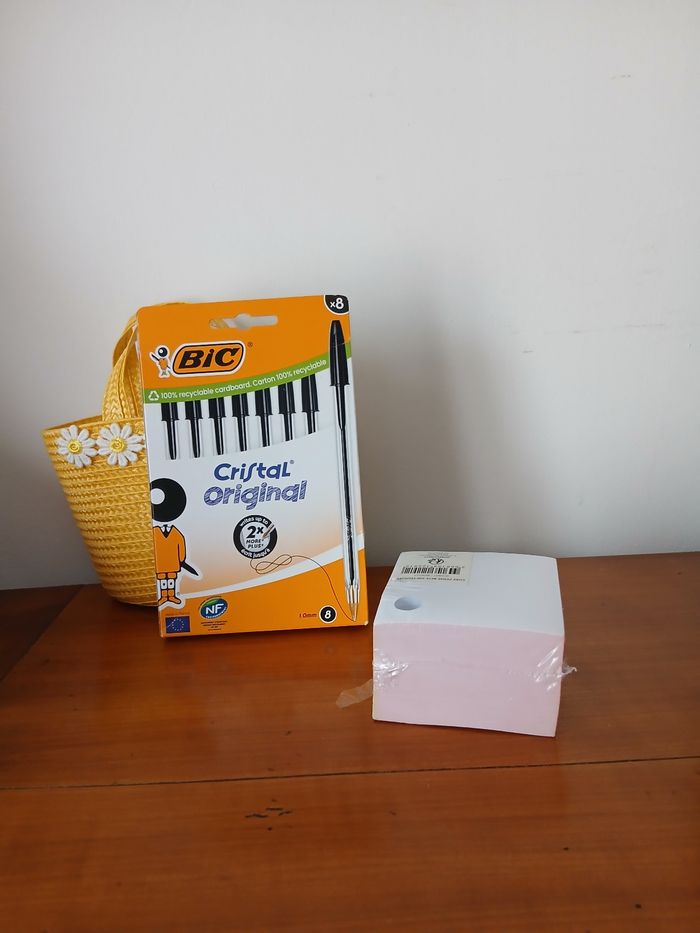 Articles neufs. 1/ Paquet scellé de 8 stylos-billes Bic "Cristal original "; encre noire ; pointe 1 mm. 2/ Cube bloc-notes de 500 feuilles blanches non adhésives. Format 7,5 X 7,5 X 4,7 cm. Perforation en coin // voir photos pour détails