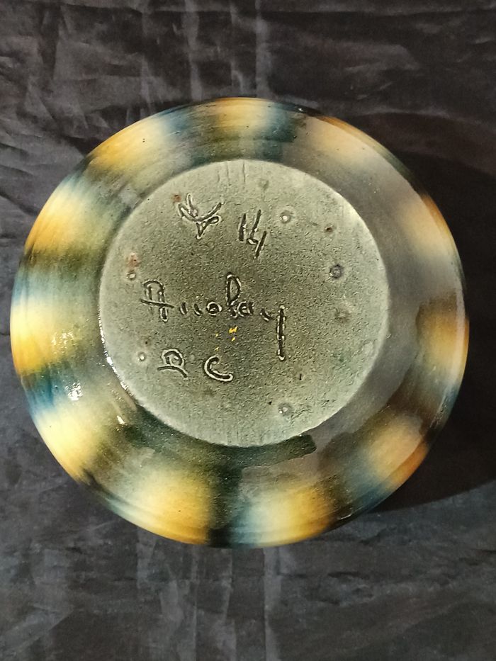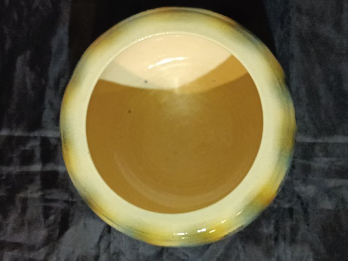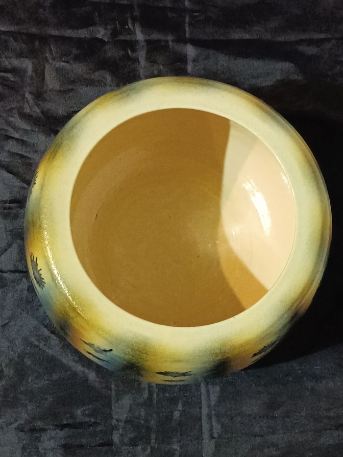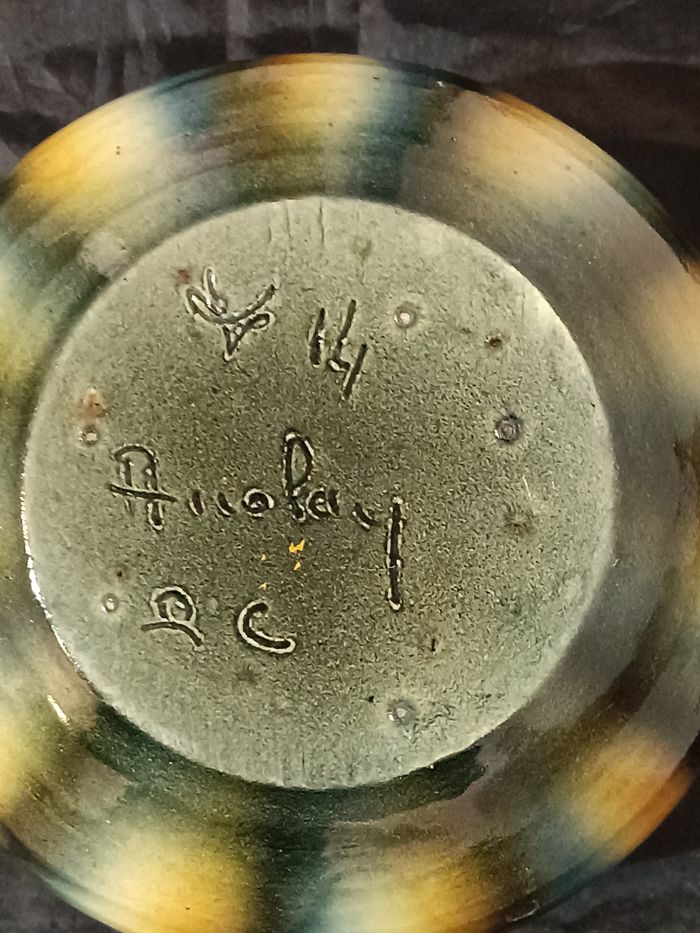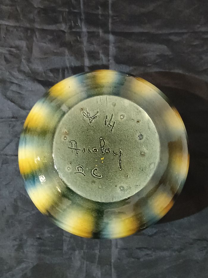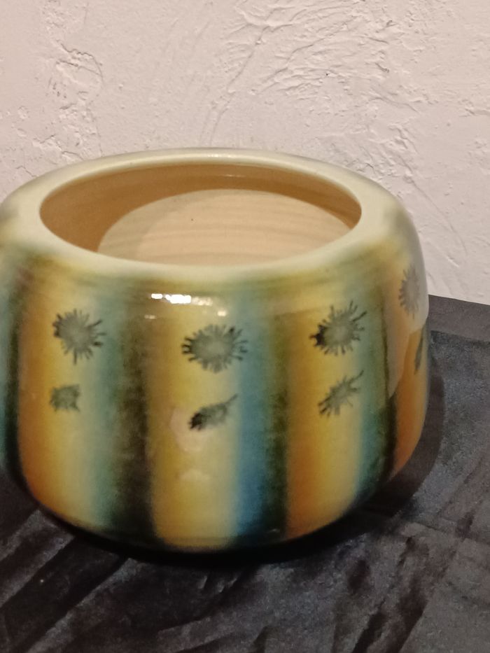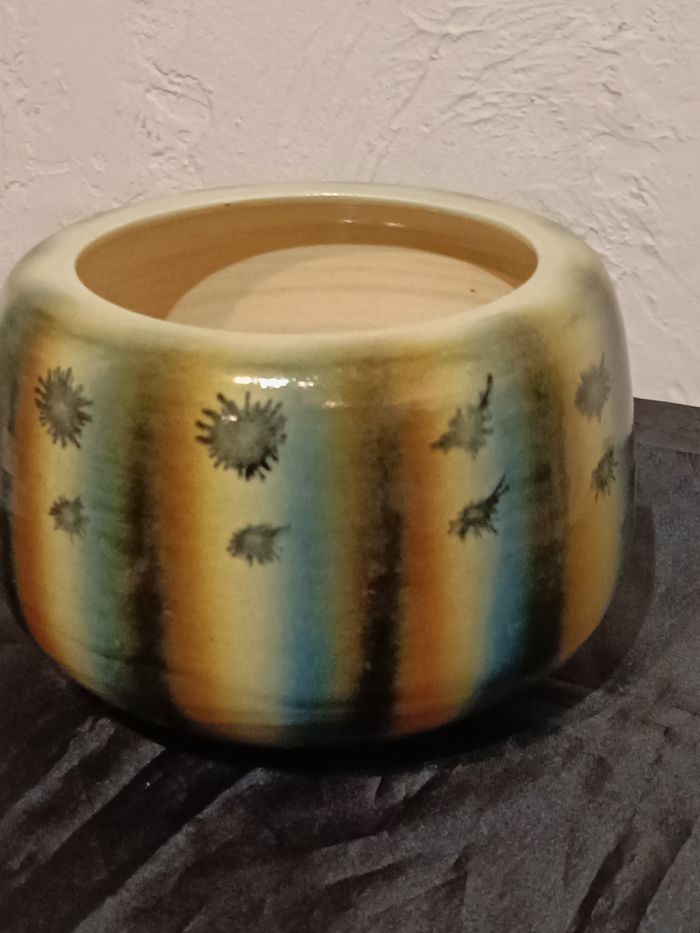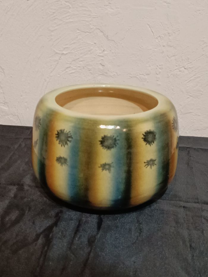 Cache pot en céramique Accolay années 60/70 16 cm x 12 cm de haut, diamètre intérieur 12 cm , bandes verticales colorées et motif d'oxydes "éclatés" marque d'usage bon état cf photos