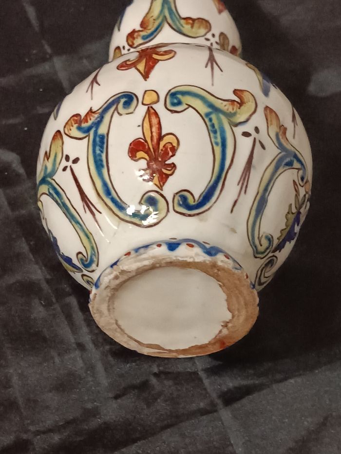 Soliflore en faïence à décor de fleurs de Lys et blason lions infimes sauts d'email dû au temps sans conséquence... hauteur 21 cm