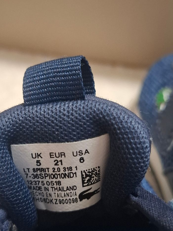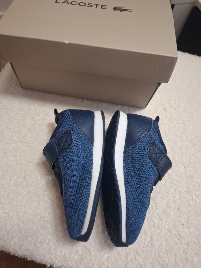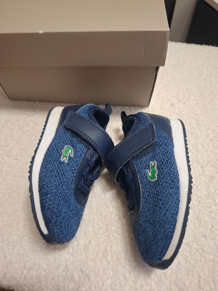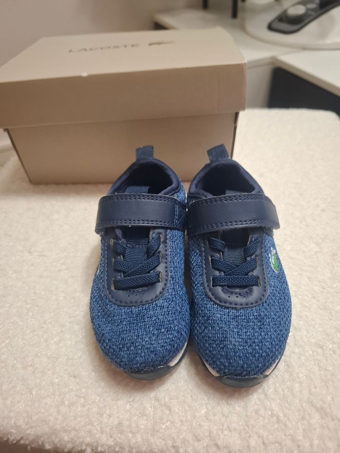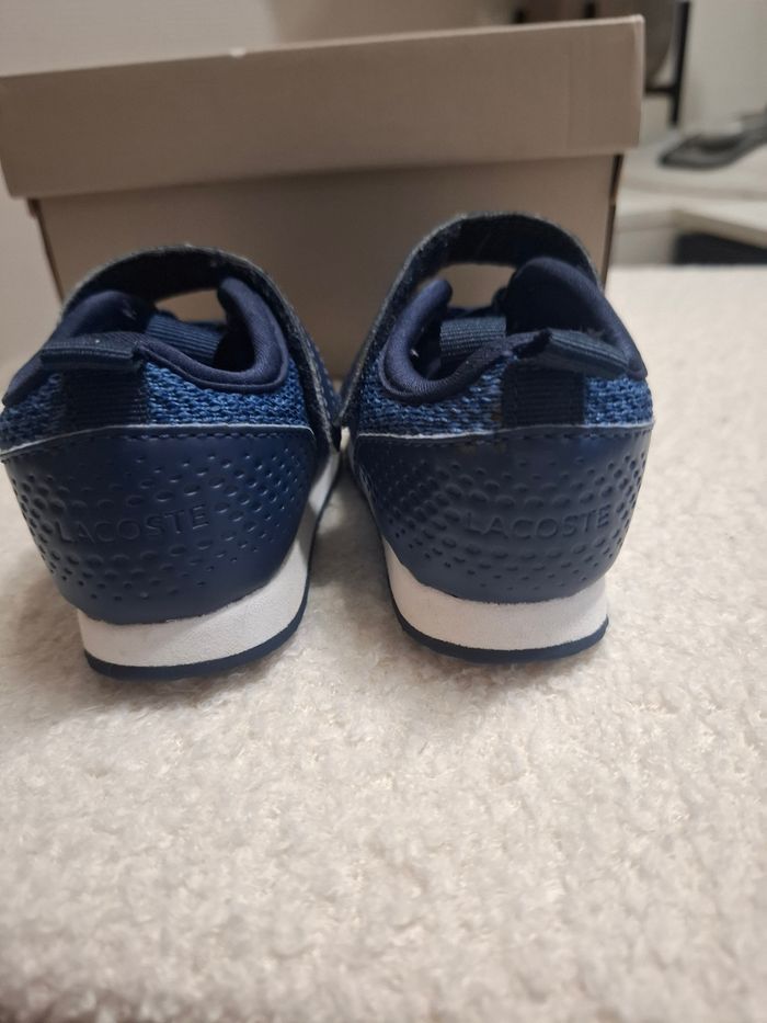 Baskets lacoste bleu en taille 21. Elles sont en très bon état. Quelques marques légères. L'élastique qui sert de lacets a été coupé puis cousu plus bas sinon il était trop difficile d'enfiler les chaussures.