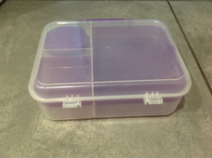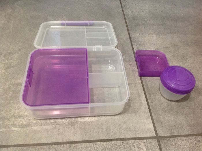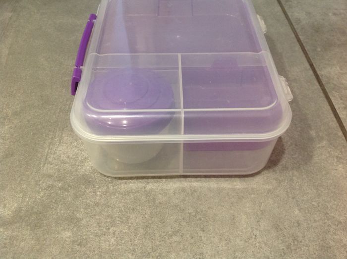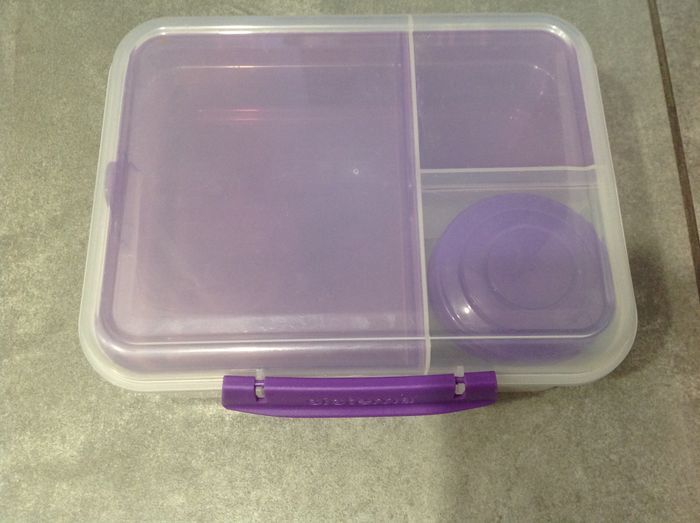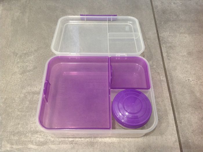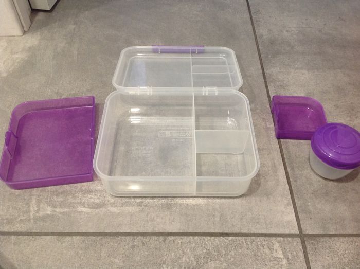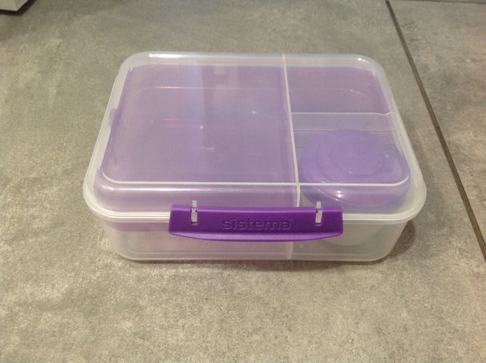 Lunch box / boîte à repas de couleur blanche et violette, de marque Sistema. Cette boîte est conçue pour garder salades, sandwiches et autres aliments frais sur le pouce, avec plusieurs compartiments pour maintenir les aliments séparés. Fermeture à clapet. Matière : plastique. Dimensions : - longueur : 22 cm - largeur : 18 cm - hauteur : 8 cm. Sans phtalate et BPA. Passe au micro-ondes et au lave-vaisselle. Très bon état.