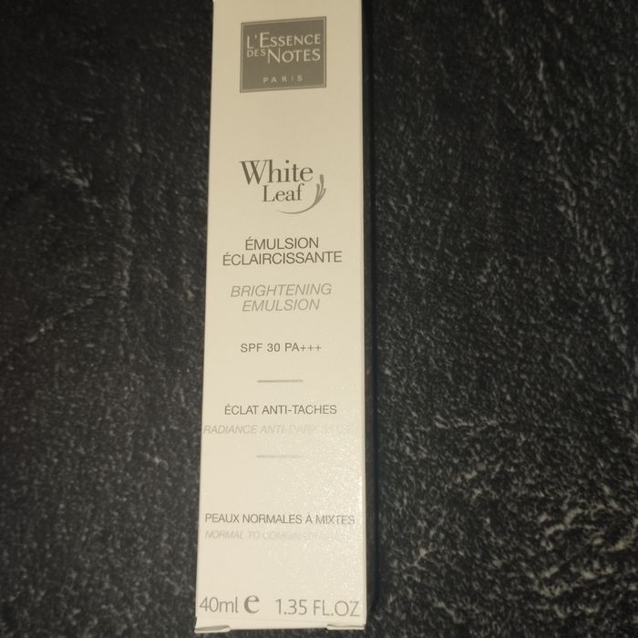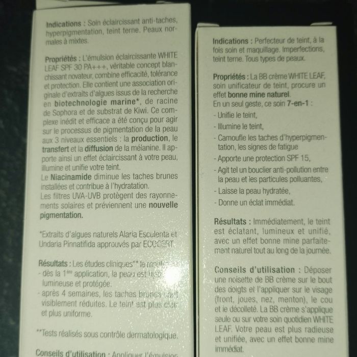 Lot de 2 produits visage : 1 Émulsion éclaircissante anti taches de la marque l essence des notes white leaf. 1 creme bb couleur neutre de la marque l essence des notes white leaf spf15 embellisseur de teint defense quotidienne.