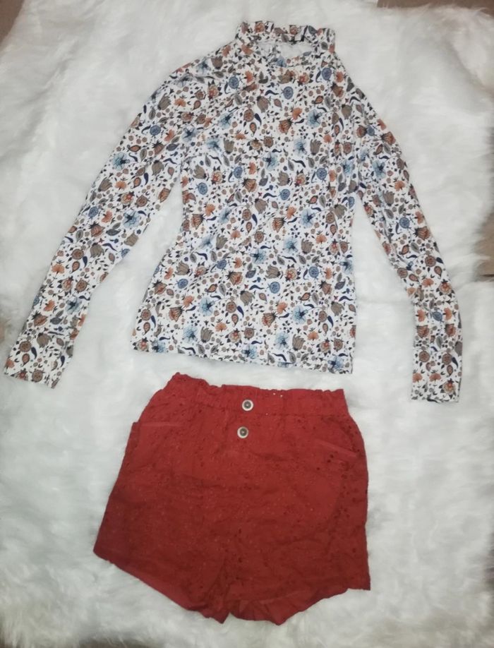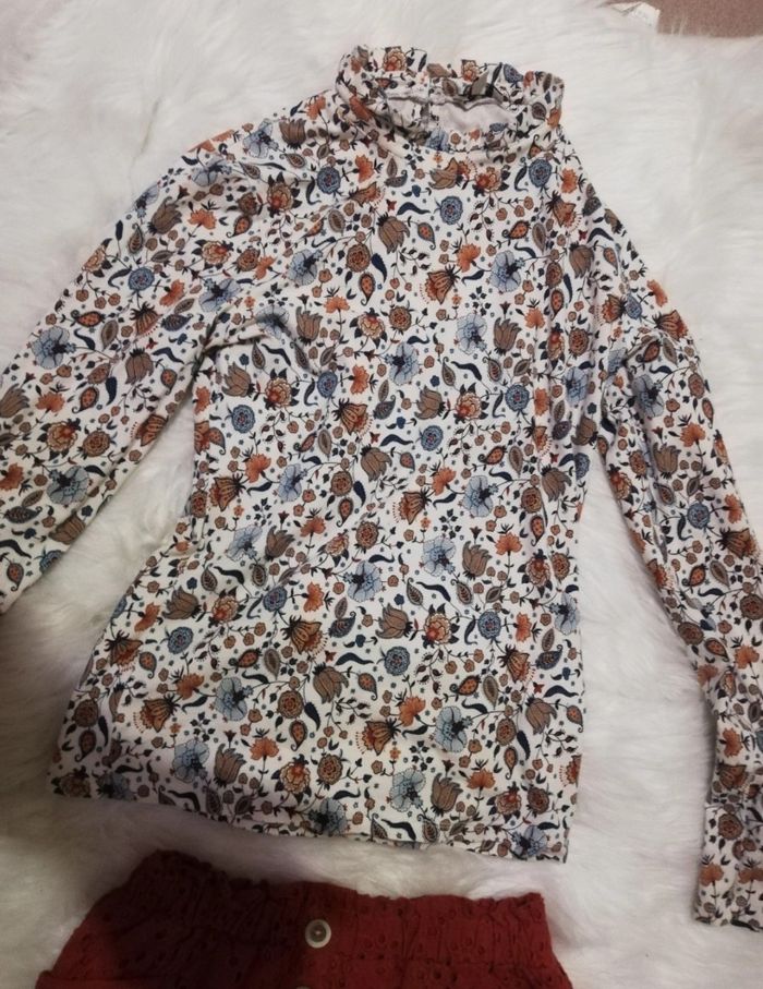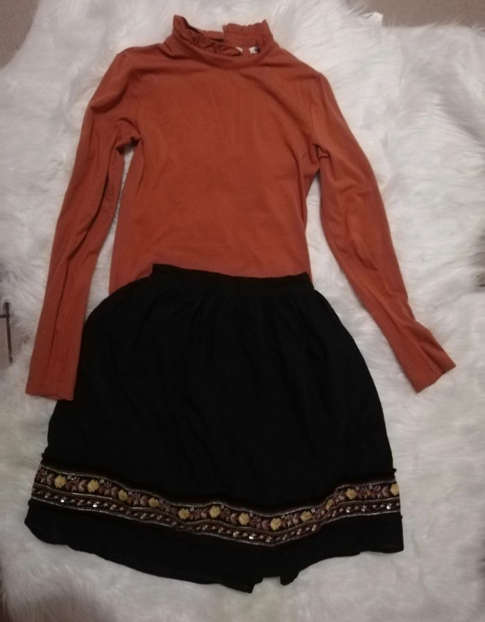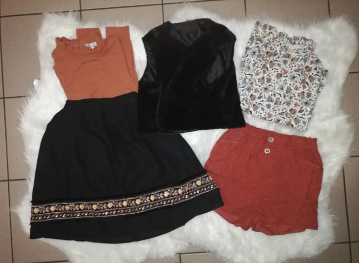 Lot vêtements fille taille 158-164. Marques c&a et primark. Comprend une jupe patineuse doublée mi longue taille élastique, un blouse couleur rouille /brique, un short taille élastique couleur rouille /brique, une blouse à motif, un gilet sans manche en poils synthétique. Très bon état. ⚠️ Prix fixe non négociable