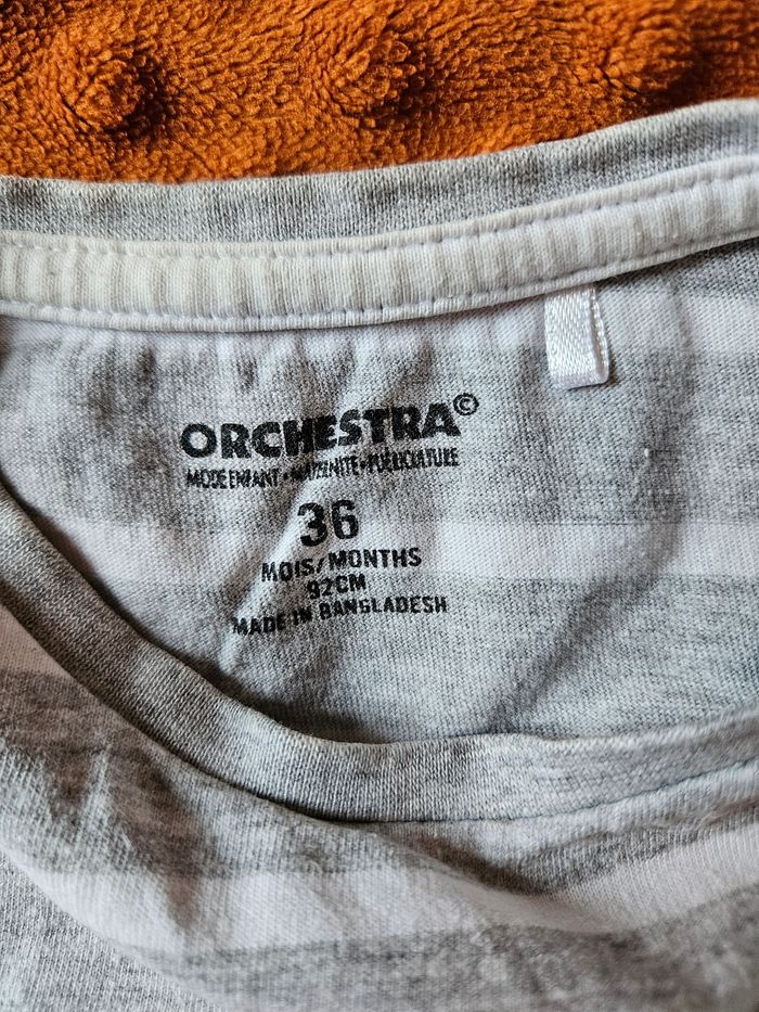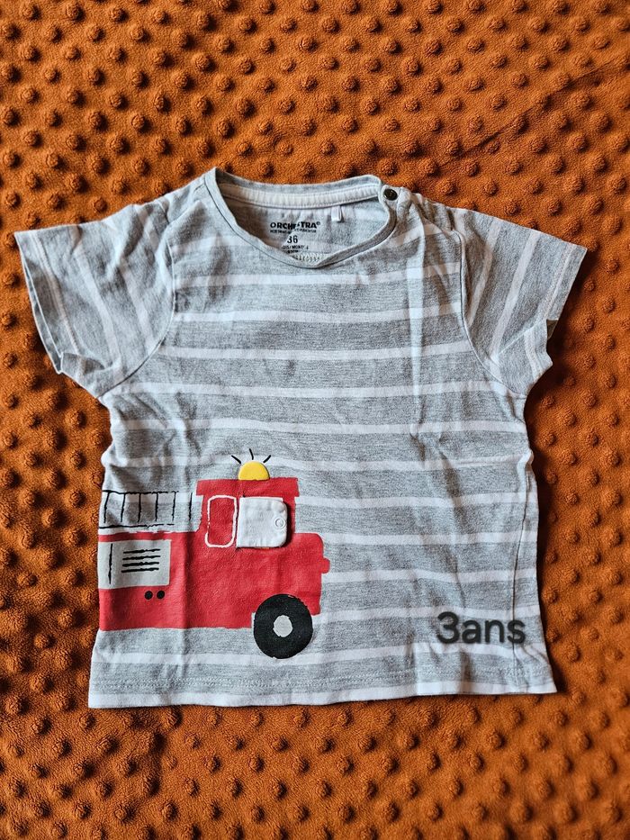 T-shirt manches courtes (MC) avec boutons pression à l'épaule, motif camion pompier, rayé blanc et gris, orchestra, taille 36 mois (92cm). Très bon, état sans trou ni tâche. D'autres vêtements sont disponibles dans mon dressing en taille 3ans