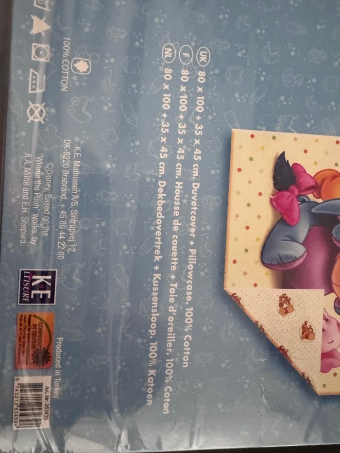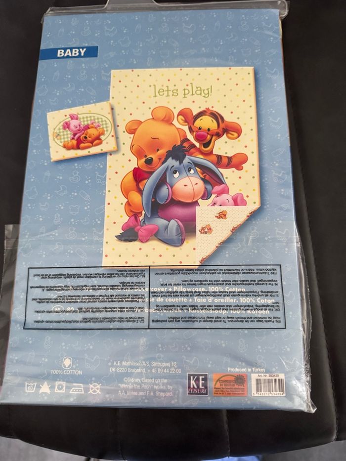 Je vends cette parure de lit Disney pour bébé, neuve avec étiquette. - Type de produit : Parure de lit,housse de couette et taie d’oreiller - Marque : Disney Winnie - Couleur : Multicolore - État : Neuf avec étiquette N'hésitez pas à me contacter pour plus d'informations.