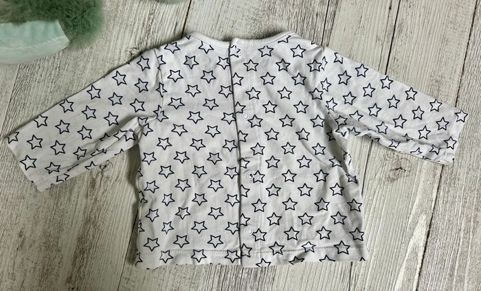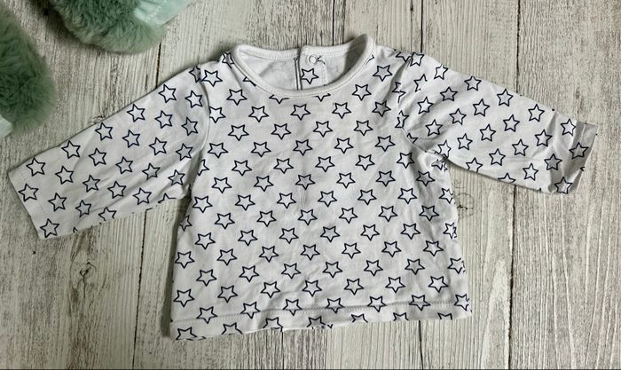 Joli haut blanc à manches longues parsemé de petites étoiles bleues. • Taille : 1 mois • Marque : Orchestra • Pratique : Ouverture pressionnée sur toute la longueur du dos pour faciliter l'habillage. • État : Très bon état ✨ #orchestra #tshirtbebe #1mois #bebegarcon #bebefille #etoile #modebebe #petitprix #layette 🌟