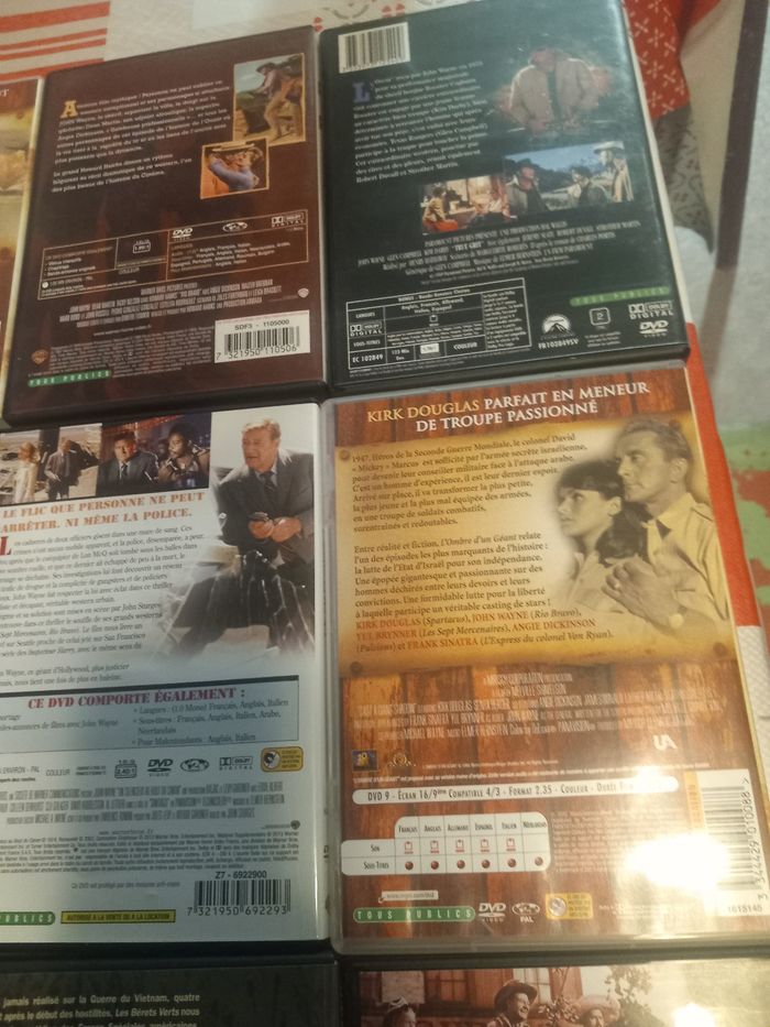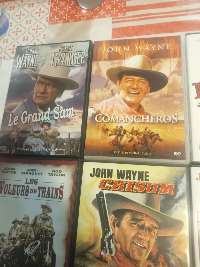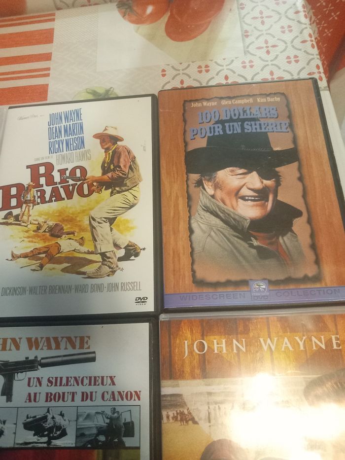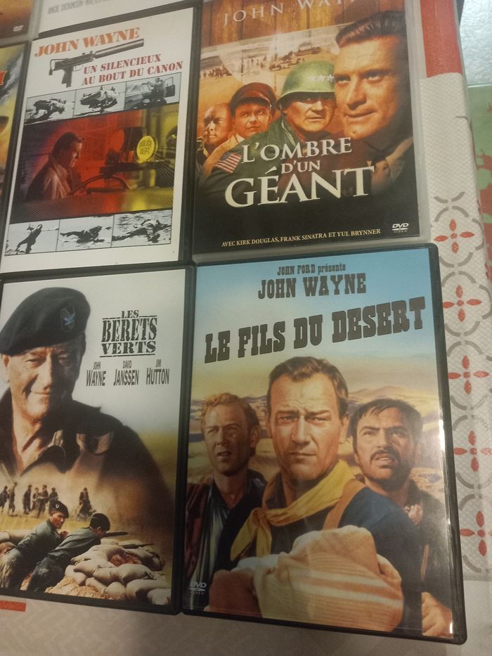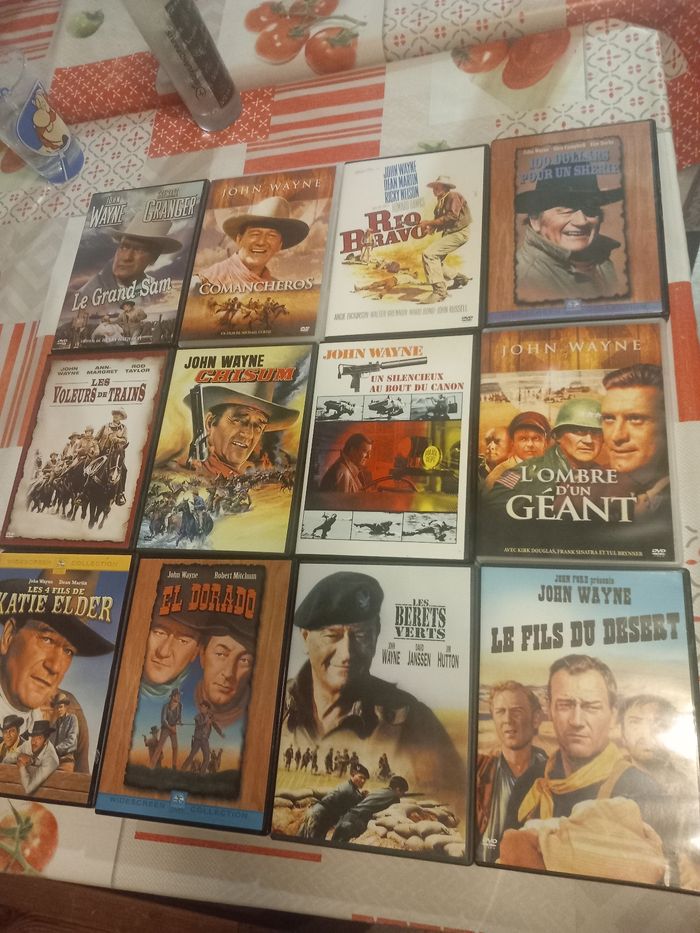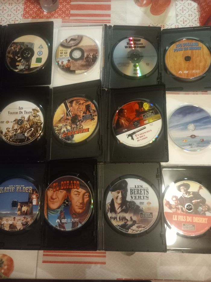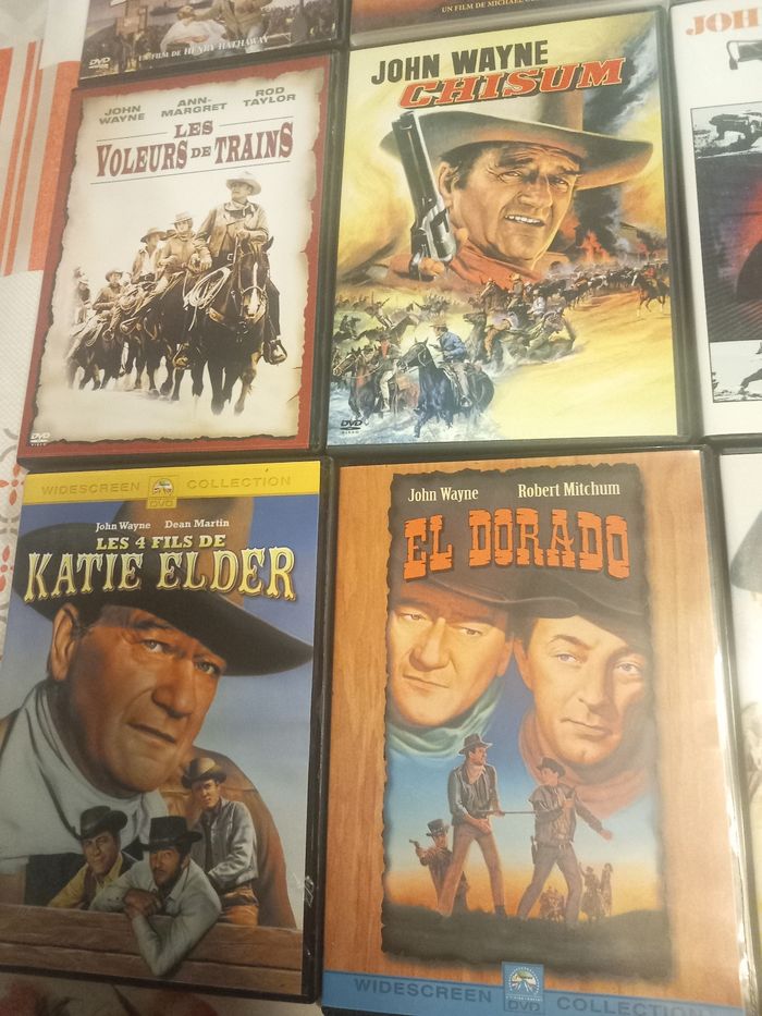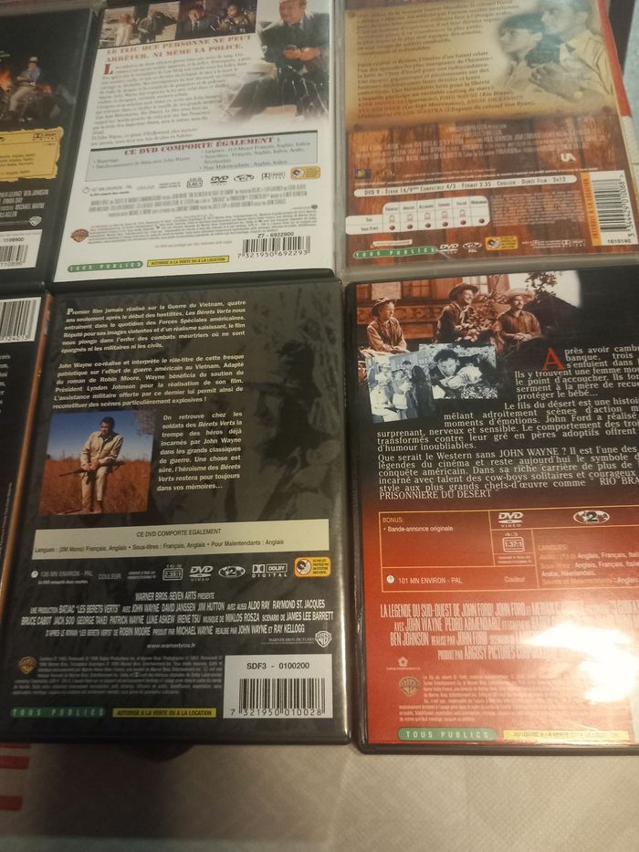 12 DVD films avec John Wayne 1 : Les 4 fils de Katie Elder 2 : El dorado 3 : Les bérets verts 4 : Le fils du désert 5 : Les voleurs de trains 6 : Chisum 7 : Un silencieux au bout du canon 8 : L'ombre d'un géant 9 : Le grand Sam 10 : Comancheros 11 : Rio bravo 12 : 100 Dollars pour un shérif En très bon état