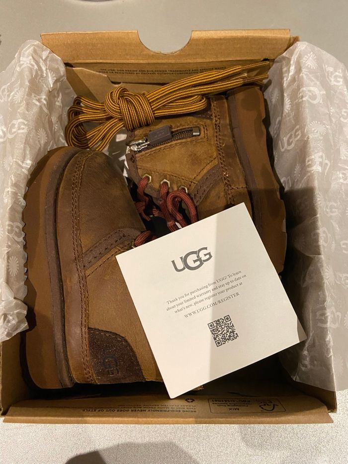 Bottes UGG garçon, taille 22 en parfait état ! Porté seulement deux fois. Paire de lacets de rechange, elles sont encore dans leur boîte.