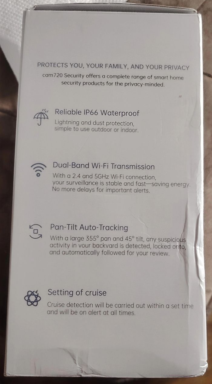 Vends caméra de surveillance intelligente JOOAN (Modèle W8-U), équipée d'un double objectif pour une surveillance complète sans angles morts. Matériel neuf, idéal pour sécuriser l'intérieur ou l'extérieur de votre maison. ​Points forts : ​Double Objectif : Une lentille fixe pour une vue d'ensemble et une lentille rotative (Pan-Tilt) pour suivre les mouvements. ​WiFi Dual-Band : Compatible avec les réseaux 2.4GHz et 5GHz pour une connexion stable et rapide. ​Suivi Intelligent : Détecte et suit automatiquement les formes humaines (Auto-Tracking) à 355°. ​Résistance Intempéries : Certifiée IP66 (étanche à la pluie et à la poussière). ​Vision Nocturne : Mode couleur ou infrarouge pour une image nette même dans le noir total. ​Application : Fonctionne avec l'application gratuite Cam720 (contrôle à distance, alertes en temps réel, audio bidirectionnel pour parler et écouter). ​Caractéristiques techniques : ​Alimentation : 5V / 1.5A ​Stockage : Emplacement pour carte Micro SD (non incluse) ou Cloud. ​Installation : Facile (murale, plafond ou posée). ​Vendu avec sa boîte d'origine et ses accessoires.