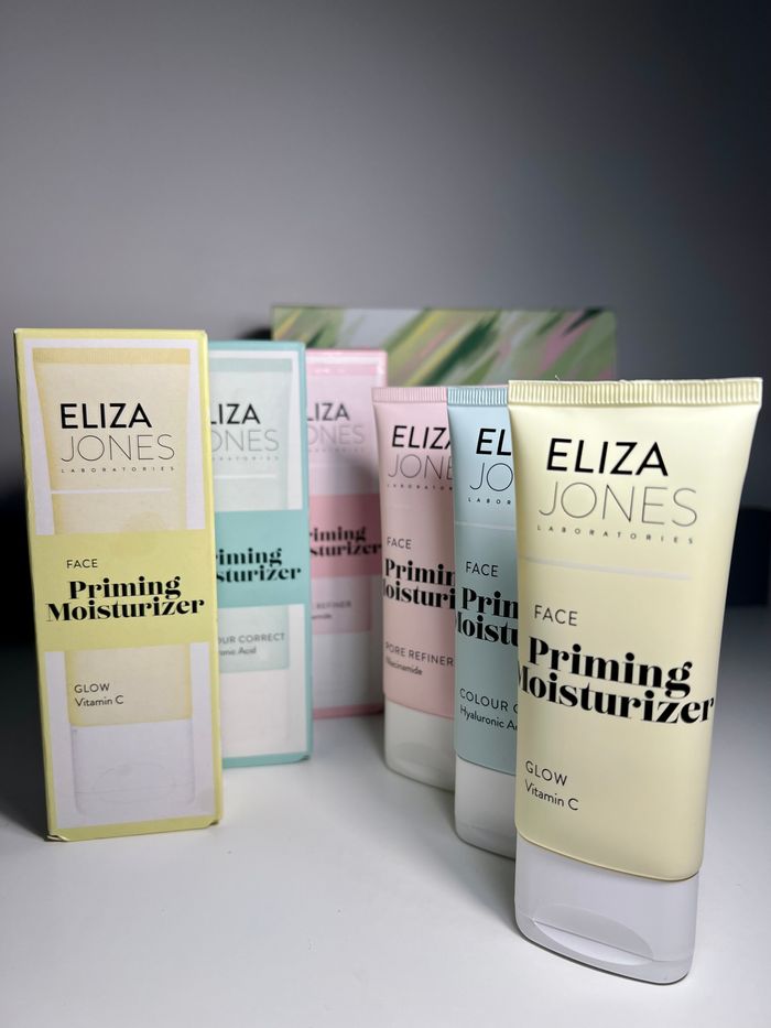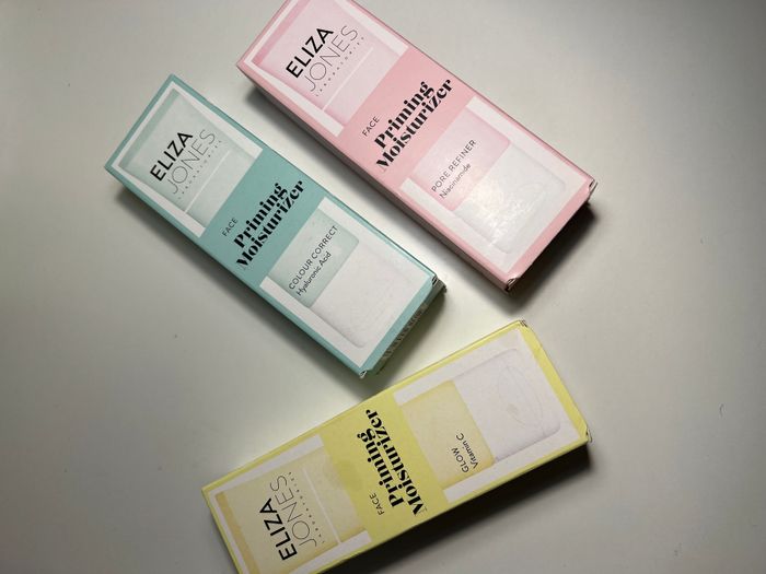 3 Bases hydratantes Face Priming Moisturizer de la marque Eliza Jones. Disponibles : 💛 Glow – Vitamine C 💙 Colour Correct – Acide Hyaluronique 💗 Pore Refiner – Niacinamide ✔ Hydratent la peau ✔ Préparent la peau avant le maquillage ✔ Texture légère