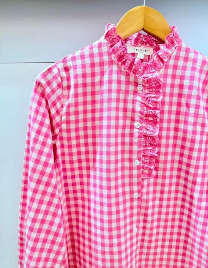 Magnifique chemise à petits carreaux roses , col montant avec froufrous , entièrement boutonnée , manches longues Taille 42 Largueur sous aisselles 58 cms