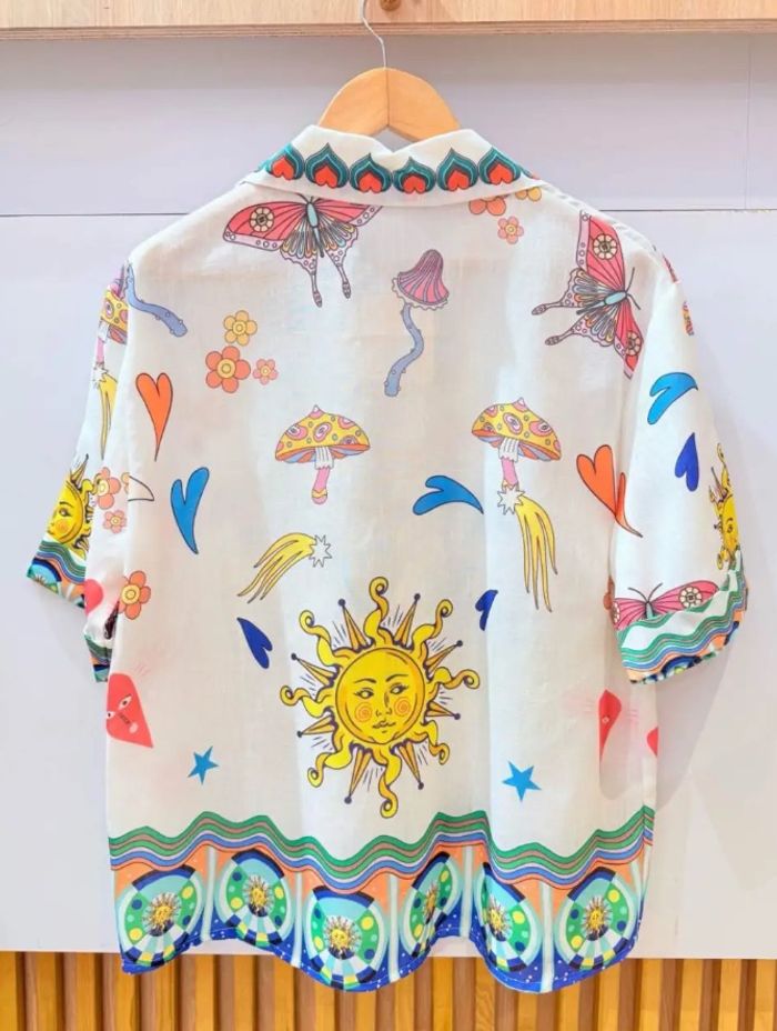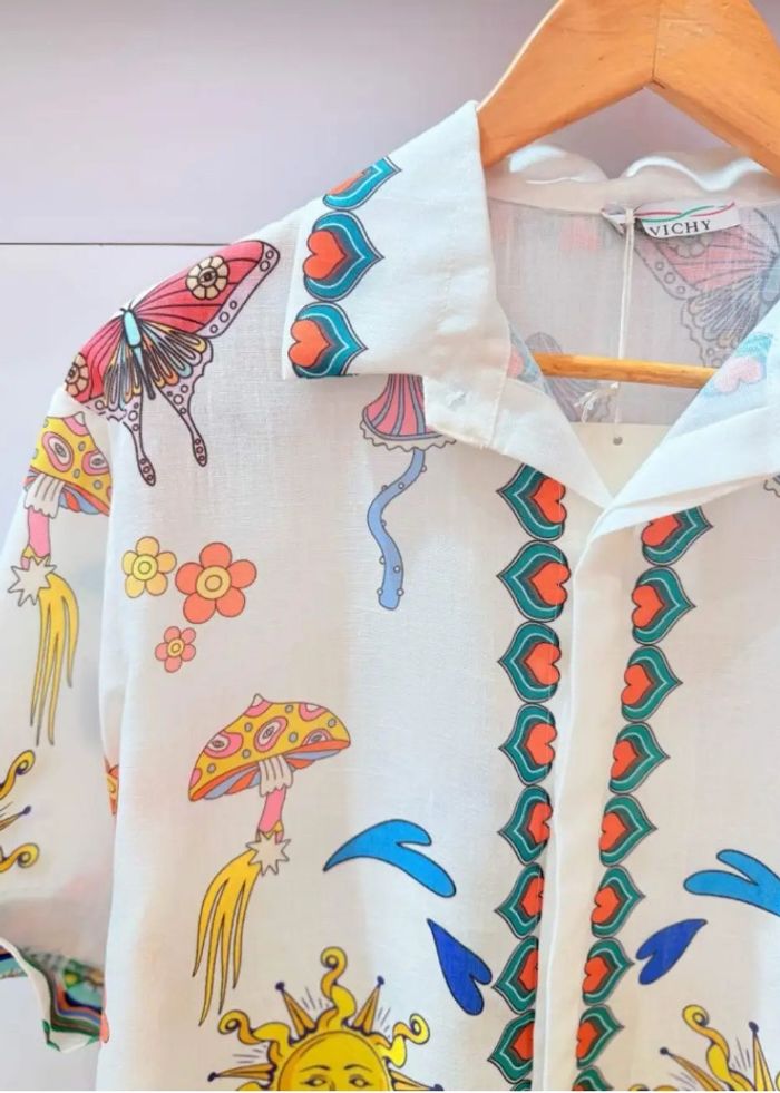 Magnifique chemise aspect lin à manches courtes et imprimé , entièrement boutonnée Taille unique qui va du 42 au 46 Largueur sous aisselles 60 cms Longueur environ 65 cms