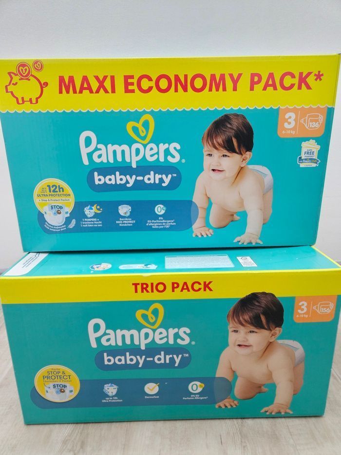Ensemble de 2 paquets de couches Pampers baby-dry Seller, comprenant un total de 292 couches. - 1 paquets de 136 couches - 1 paquets de 156 couches