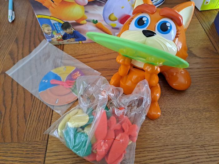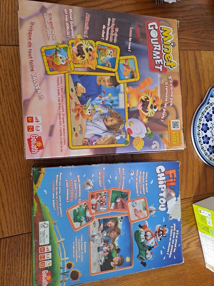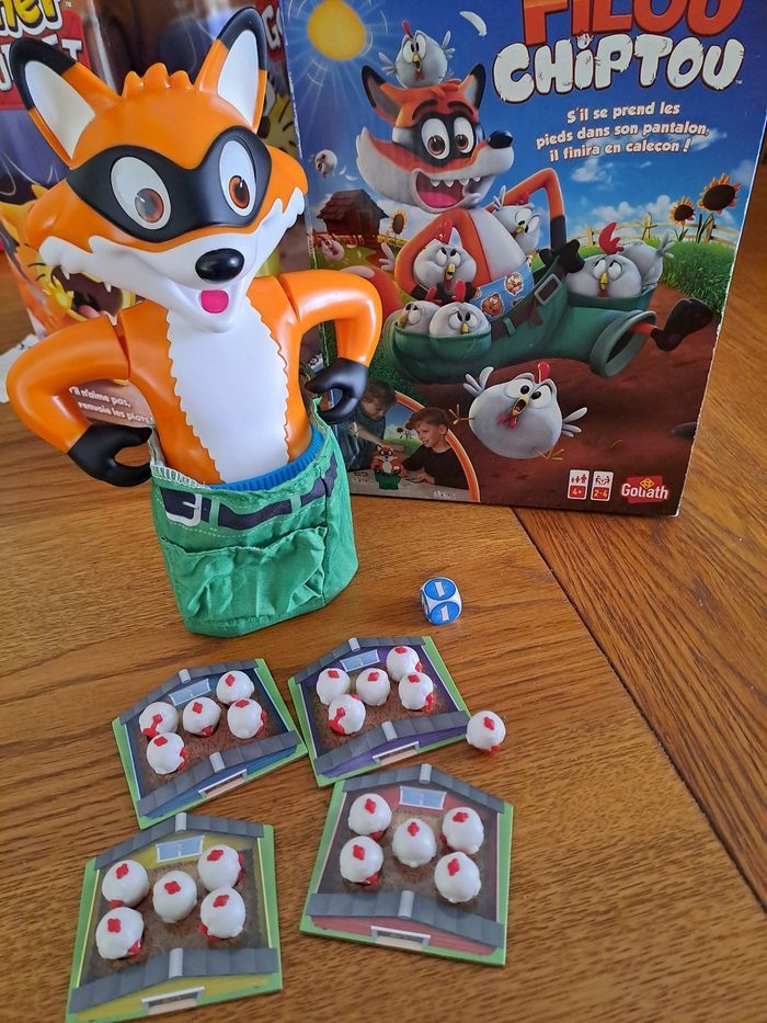 Vend 2 jeux de sociétés amusant en lot et non séparément Minet Gourmet et Filou Chiptou en URGENCE Il ne manque aucune pièces dans ces jeux ils ont étés utilisés très peut de fois (4 fois chacun) Filou Chiptou contient : 1 Filou Chiptou (autocollants déjà mit sur le dé et Filou Chiptou) 21 poules 4 poulailler La règle du jeu (qui s'est enroulé dû au rangement du jeu a force mais très très lisible) Minet Gourmet contient : 1 Minet Gourmet 1 assiette 20 légumes (4 carottes, 4 tomates, 3 epis de maïs, 3 gousses d'aïl, 3 salades, 3 brocolis) 1 roulette (Il manque juste la règle du jeu mais il y a la règle au dos de la boîte) PS : les boîtes sont abîmés avec le temps comme indiqués sur les 7 premières photos mais sinon les jeux eux même sont nikel aucun défaut il ne manque rien 🙏 ⚠️ Non en main propres propre seulement en livraison, Éxpedition rapide et bien emballé 📦