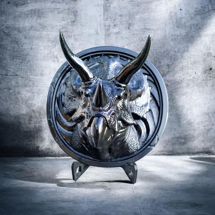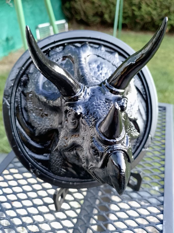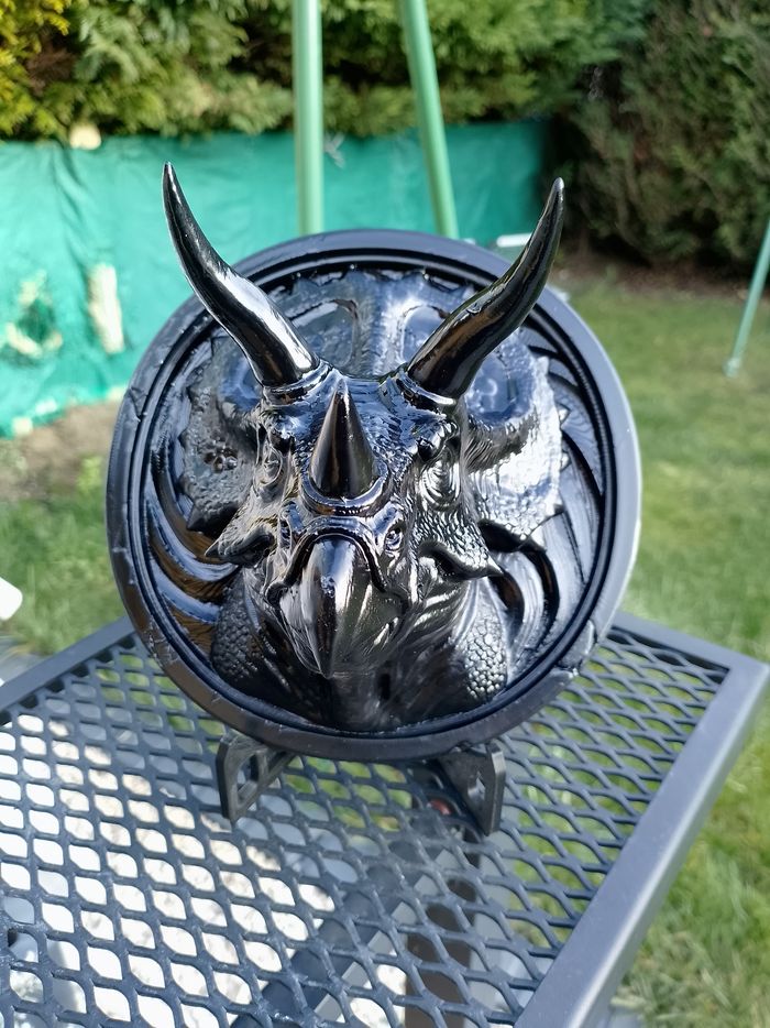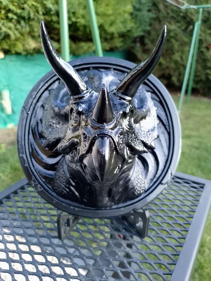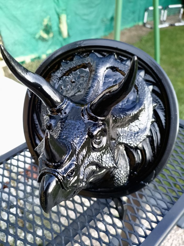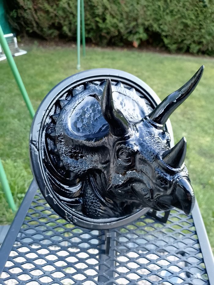 Figurine impression 3D décoratif Triceratops Figurine en relief Diamètre de la plaque 18 cm Hauteur du relief de la tête 10 cm Hauteur de la plaque 1,5 cm Couleur noire Vendu avec le support Neuve N'hésitez pas à demander si vous souhaitez des renseignements