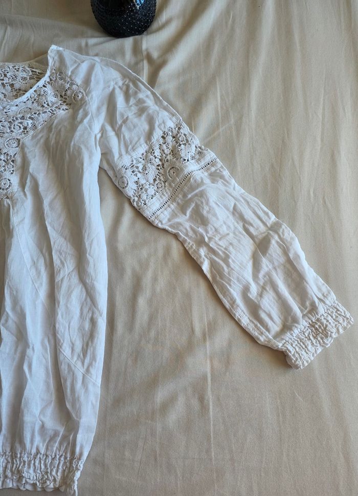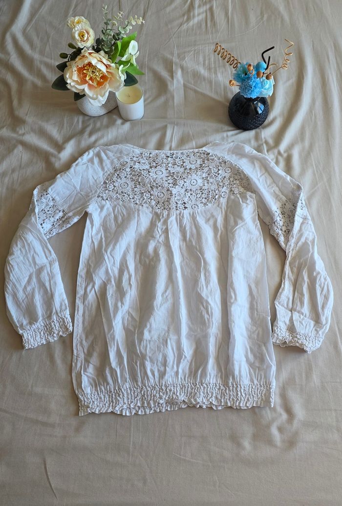 ​✨ ÉTAT : Très bon état. Le blanc est resté bien éclatant, la dentelle est intacte et ne présente aucun fil tiré. ​📏 TAILLE & COUPE : Taille 40 (L). Coupe fluide de style bohème avec une base élastiquée pour un joli effet blousant. Manches longues avec finitions poignets élastiqués. ​🌿 MATIÈRE : 100% Coton. Tissu léger, frais et très agréable à porter. Magnifiques empiècements en dentelle travaillée au niveau du décolleté, des manches et du haut du dos. ​📦 LIVRAISON : Envoi via Mondial Relay (lockers), Shop2Shop ou Chronopost (point relais physique). ​🎁 Réductions sur les lots activées ! C'est le moment de craquer pour plusieurs articles.